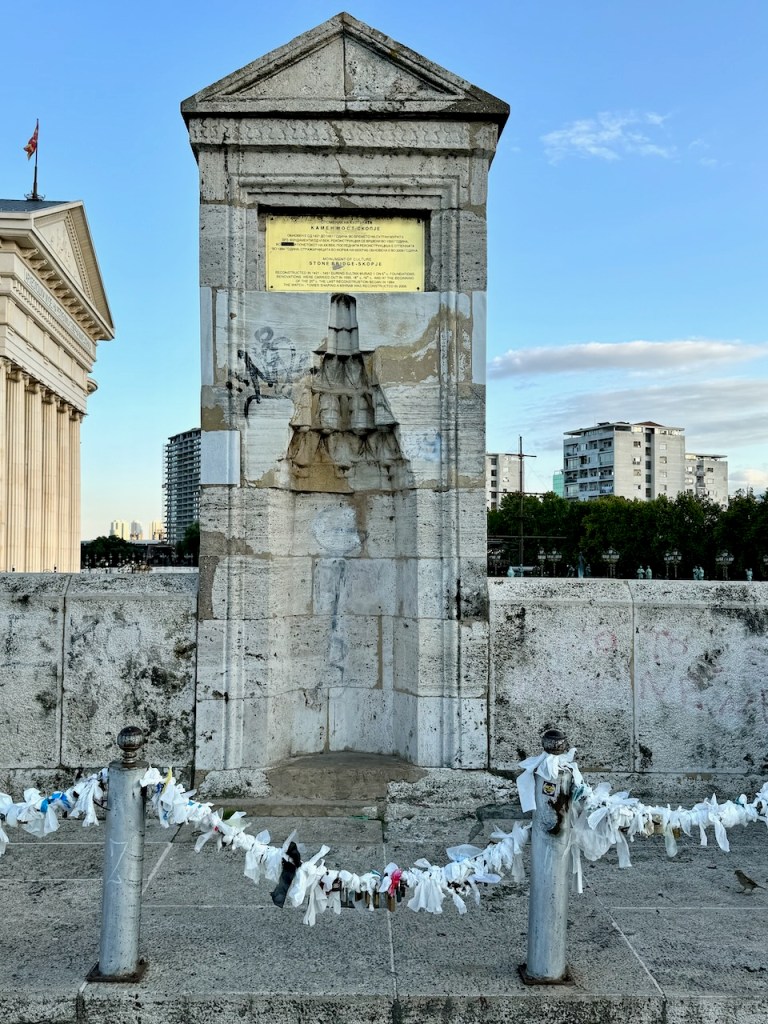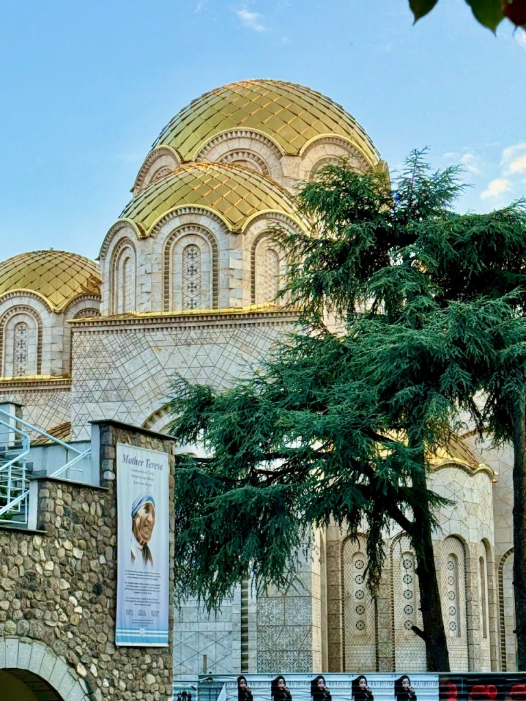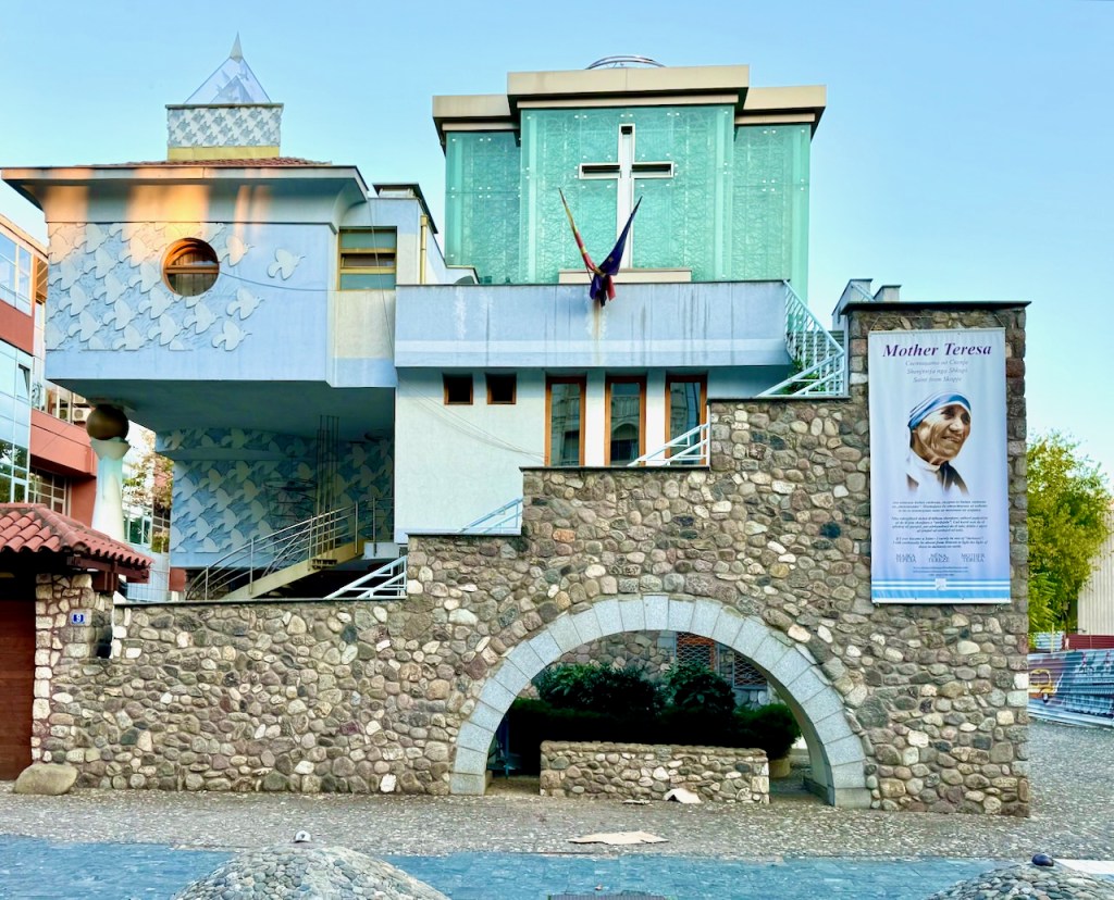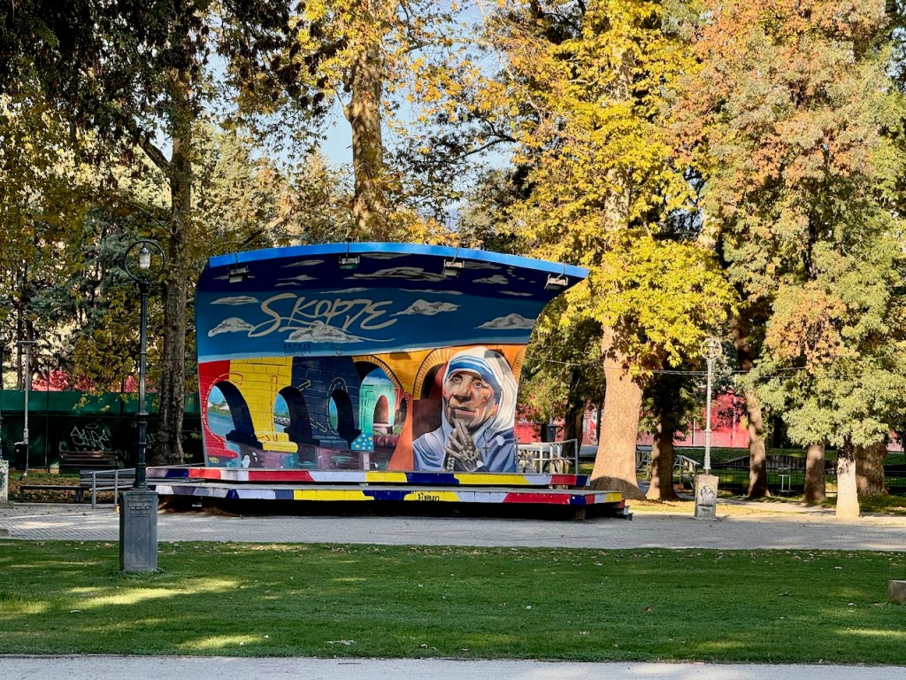 Skopjen kunnioitusta Äiti Teresaa kohtaan on pitkin Skopjea. On Äiti Teresan aukio, klinikka, muistotalo, patsas, ja seiniin laitettuja sitaattitauluja. “Jos et voi ruokkia sataa ihmistä, ruoki edes yksi” on Makedonia-aukion laidalla, “Kohdatkaamme toisemme aina hymyillen, sillä hymy on rakkauden alku” nähtiin jossain muualla.