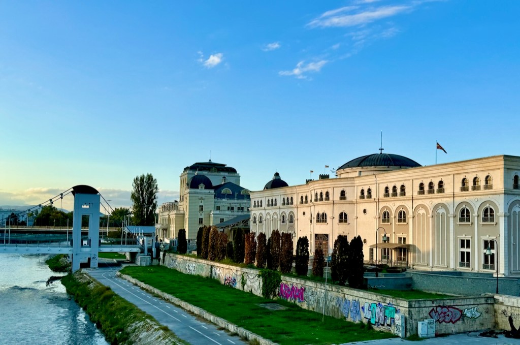 Näitä rakennuksia katsellessa on juuri erityisen keskellä sitä historiaa, joka alkoi siitä, että vuonna 1963 kaupunkia ravisteli massiivinen maanjäristys, joka tuhosi rakennuksia valtoimenaan. Uudelleenrakentaminen alkoi pian ja ajan hengen mukaisesti lopputuloksena on brutalistinen arkkitehtuuri. Tämä kaikki oli Jugoslavian historiaa ja Venäjän vaikutteita, mikä oli enemmän ristiriitainen kehitys kuin myönteinen, vaikka ympäristö uudistuikin. Poissa olivat kuitenkin vanhat historialliset rakennukset. Sitten alettiin pyrkiä muutokseen ja aloitettiin Skopje 2014 -projekti, jonka tarkoituksena oli tuoda kaupunkiin historiallisempi ilme vuoteen 2014 mennessä. Rakennusten uudelleenrakennus näkyy hienoina vanhojen rakennusten mukaisina näkyminä. Kritiikki perustunee usein siihen, että rakennusprojektiin liittyi korruptiotilanteita.