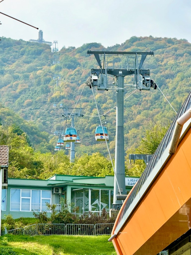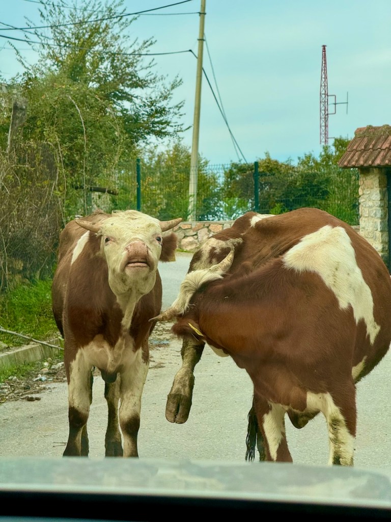 Vodnon huipulle pääsee vuoren puolivälistä lähtevää gondolihissireittiä pitkin, joka on sinänsä helppo ratkaisu, mutta meillä olikin ollut hankala pääsy sinne edellisenä päivänä. Moni on suositellut taksia tai bussia numero 25, mutta me luulimme ajavamme autolla helposti. Navigaattoriin osoite, sitten serpentiinejä ylös. Mutta sitten tuli totaalinen stoppi. Navigaattori luuli selvästi meidän olevan matkalla lenkkareilla, ei autolla. Ei ollut mahdollista kääntyä sinne, minne navigaattori ohjasi, ja tiellä alkoi näkyä lehmiä ja muitakin eläimiä.