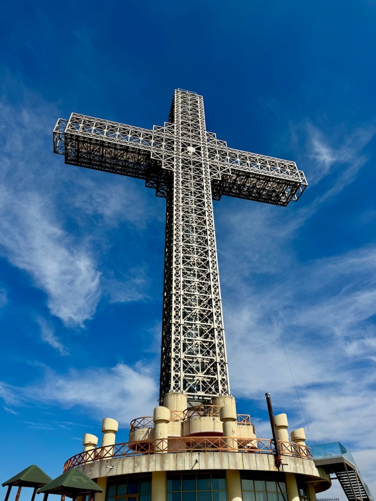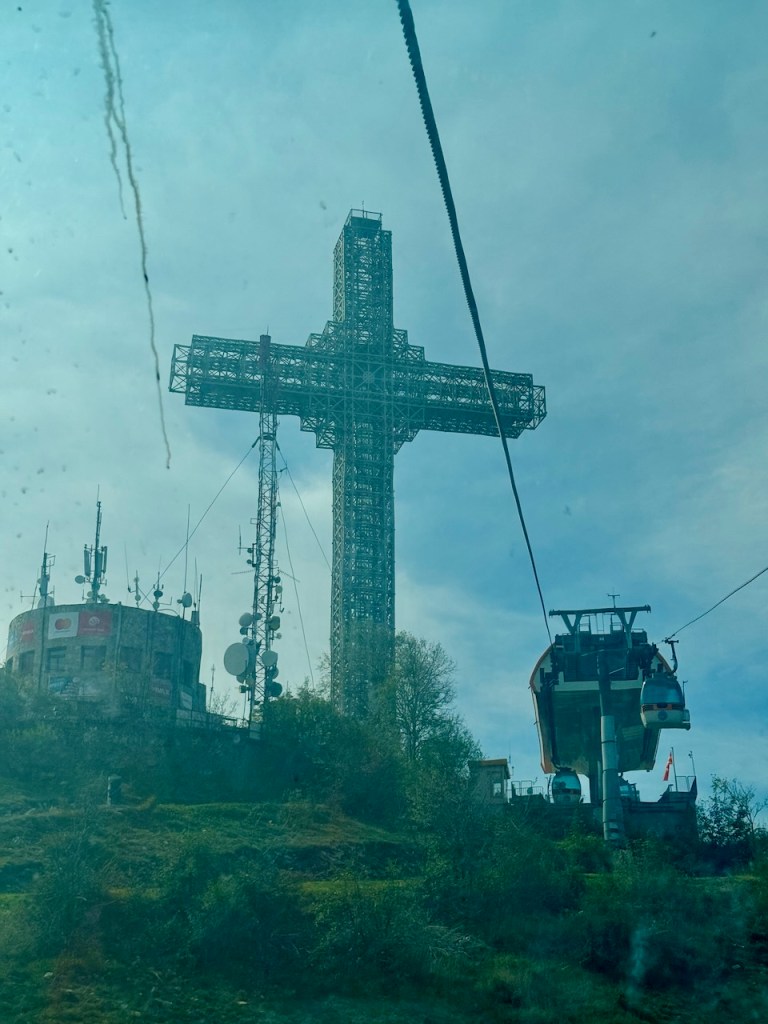 Pimeässä korkealla mäellä näkyi valaistu risti, eli Vodno-vuoren huipulla oleva Millennium-risti. Olimme käyneet siellä edellisenä päivänä.