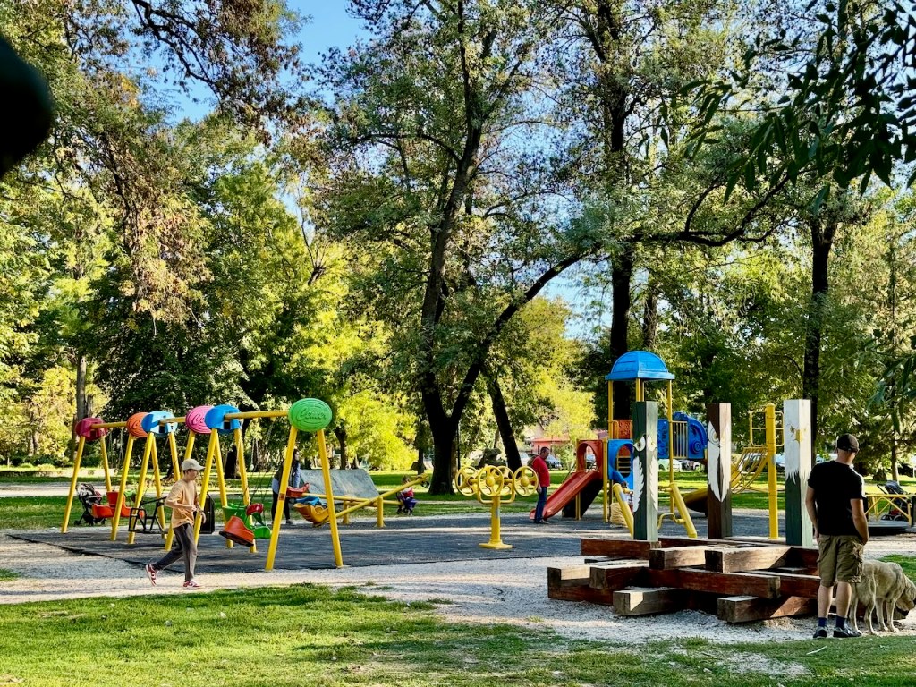 Puisto on Vardar-joen varrella, ja jokivarressa on myös selkeät pyöräilyväylät. Joen yli myös kävelysilta ajoväylien lisäksi.
