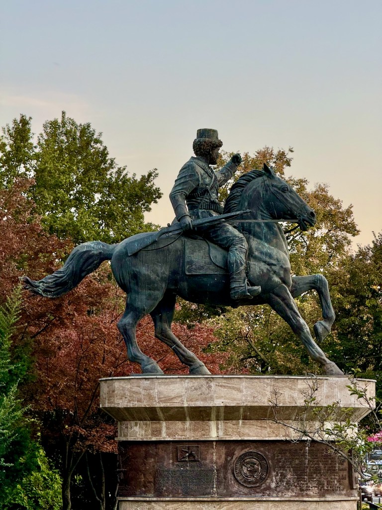 Paljon keskustelua herättänyt patsas on tämä Ratsastajapatsas. Se on patsaista suurin kohoaa yli 20 metrin korkeuteen ja esittää Aleksanteri Suurta ratsailla. Patsasta on kutsuttu myös pelkästään soturiksi ratsailla, sillä Kreikan kanssa käyty poliittinen kädenvääntö Makedonian kulttuuriperinnöstä on hiertänyt naapurimaiden välejä jo vuosia. Luin, että nämä patsaat ovat ansainneet Skopjelle lisänimen mauttomuuden pääkaupunkina. No, emme oikein näkemämme perusteella näin sanoisi. Mitä mauttomuutta hienot näkymät nyt muka ovat?