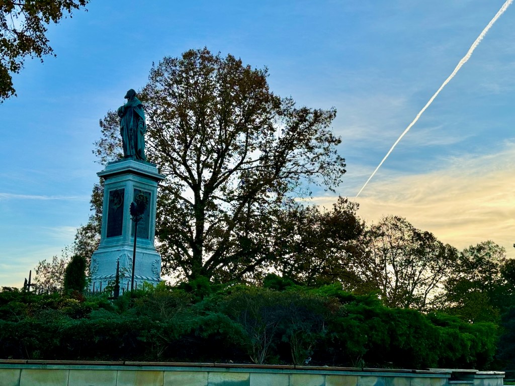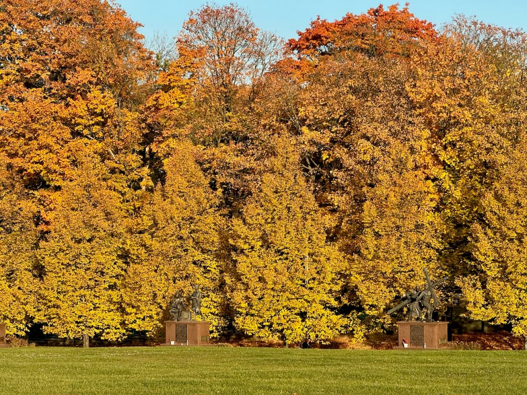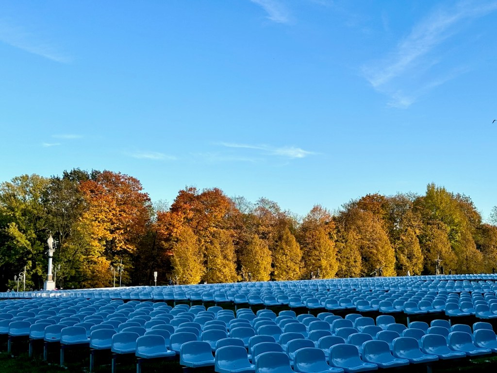 Hetkessä oltiin täällä. Luostarin edessä oli ruskan värittämän puiston reunustama suuri aukio, jonka penkkirivit takuulla kuvasivat sitä väkimäärää, joka täällä joihinkin tapahtumiin osallistuu.