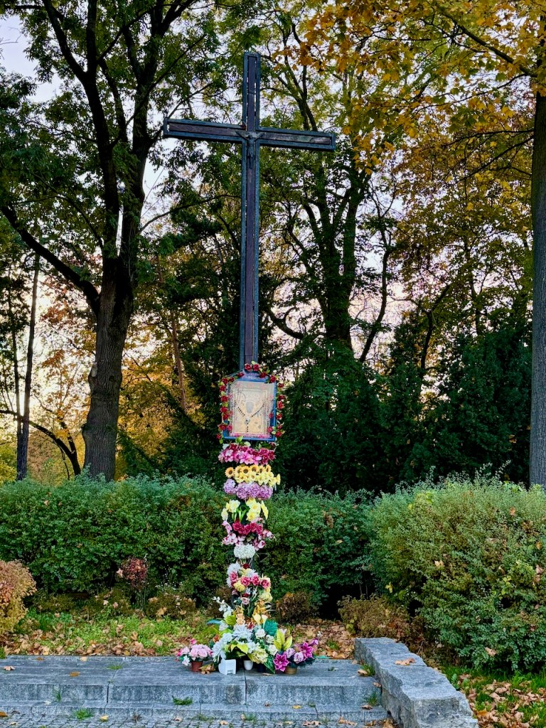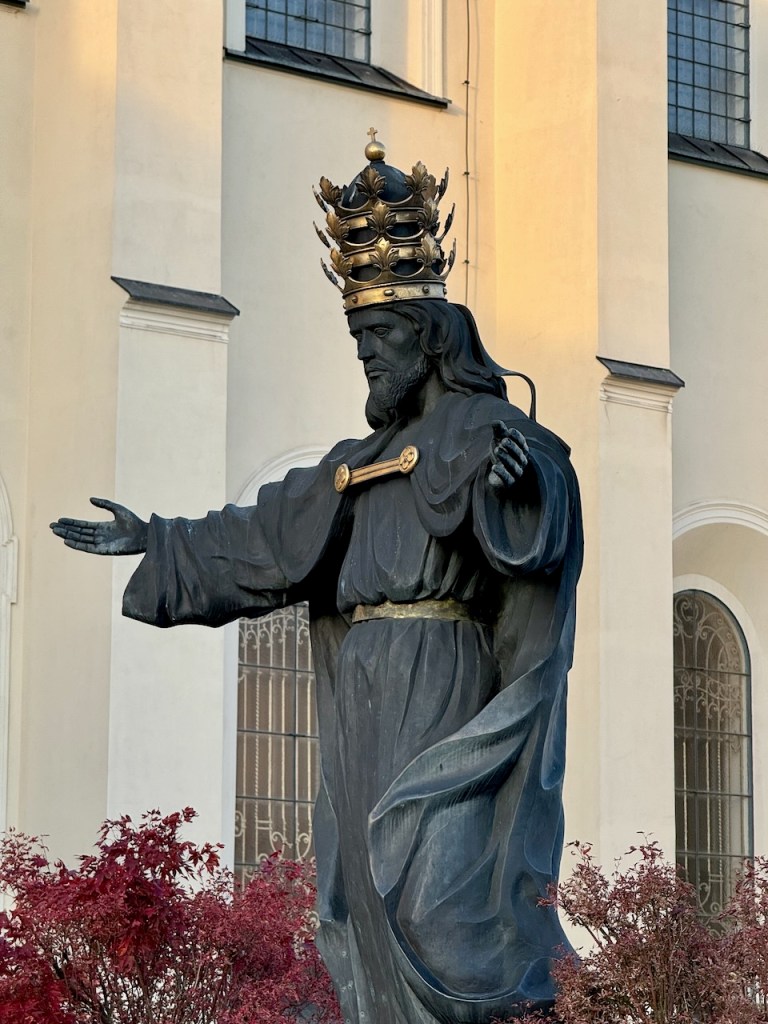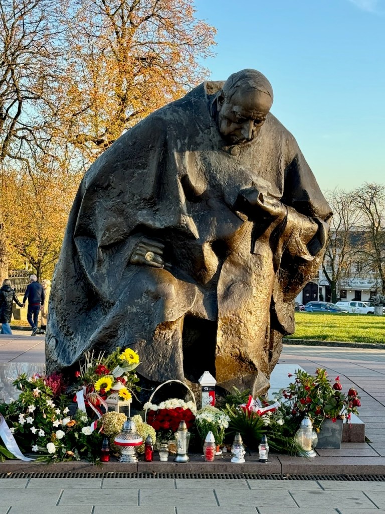 Luostariin mennessä oli myös pyhiinvaeltajille tärkeän henkilön eli puolalaisen jesuiitta Pyhän Stanislaus Kostkan patsas. Kukkatervehdyksiä näytti olevan runsaasti.