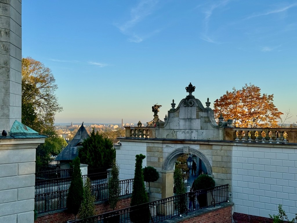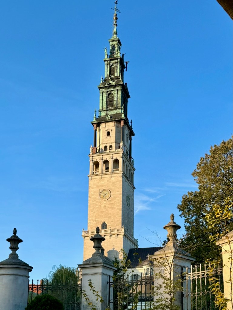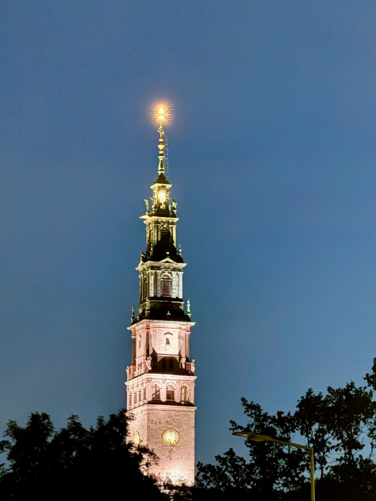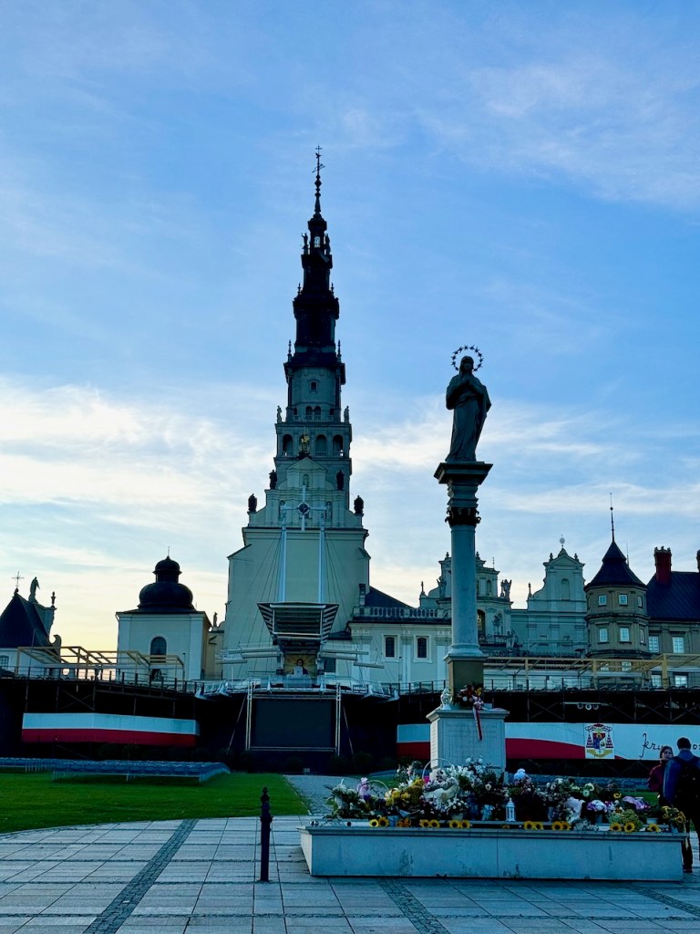 Sitten tulimme isolle aukiolle, jonka laidalla on Czestochowan museo ja sen yhteydessä näkötorni. Sieltä ilmeisesti olisi vaikuttava näköala, josta on panoraamanäkymä kaupunkiin. Illalla ei enää ollut auki, mutta jos olisimme täällä päivällä, varmaan kannattaisi. Aukiolta oli uusi iltanäkymä myös takaisin käymäämme Jasna Goran luostariin.