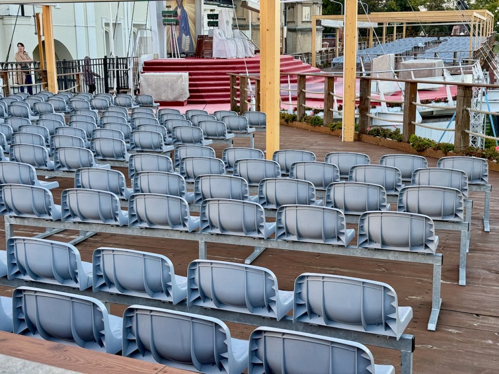 Piha-alueelta oli myös näkymät luostarille tullessamme ohittamallemme penkkejä täynnä olevalle aukiolle ja sen edessä olevalle esiintymislavalle tai ehkä jonkinlaiselle alttarille.