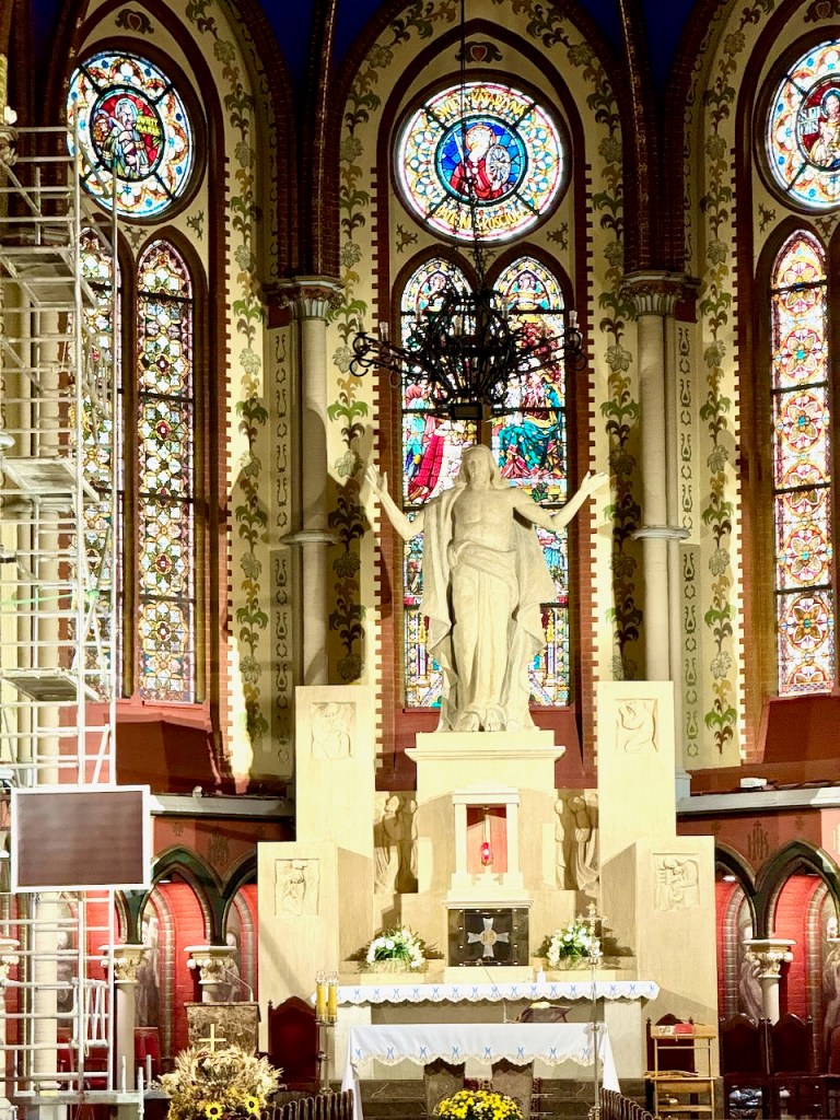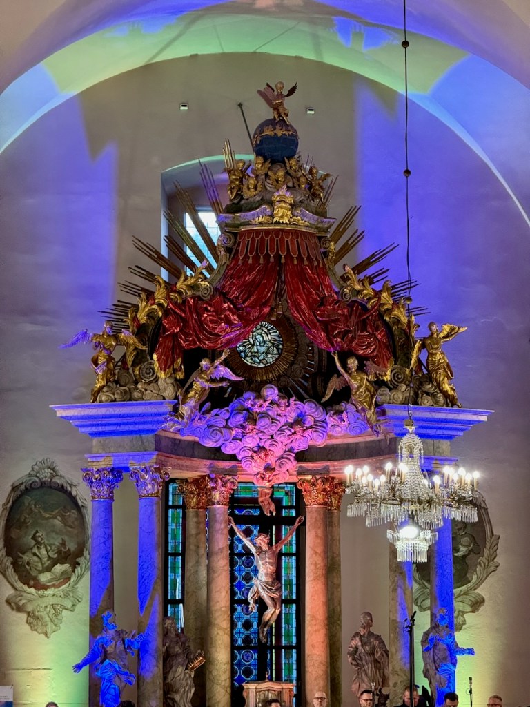 Pääsimme kurkistamaan sisälle takaovelta, koska kirkossa oli menossa kuorokonsertti. Hienolta näytti, tosiaankin vähemmän koristelua kuin yleensä täällä, mutta kuoron takana oli vaihtuvia värillisiä valoja.