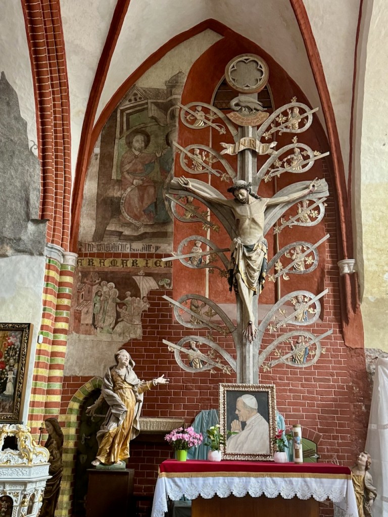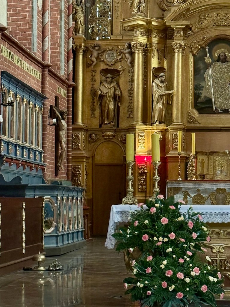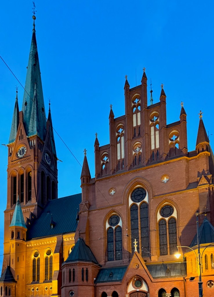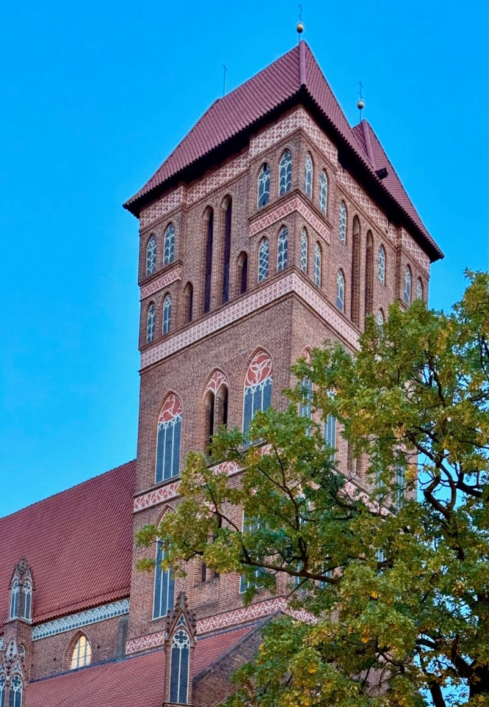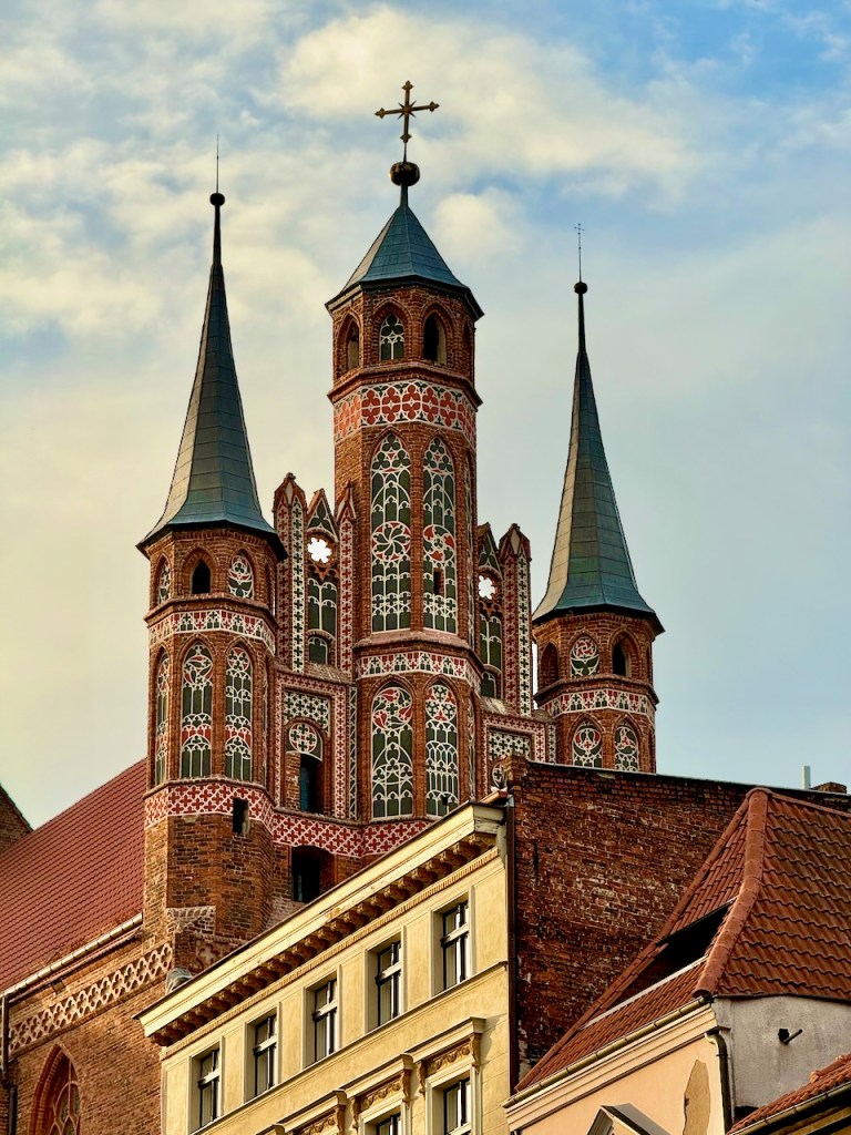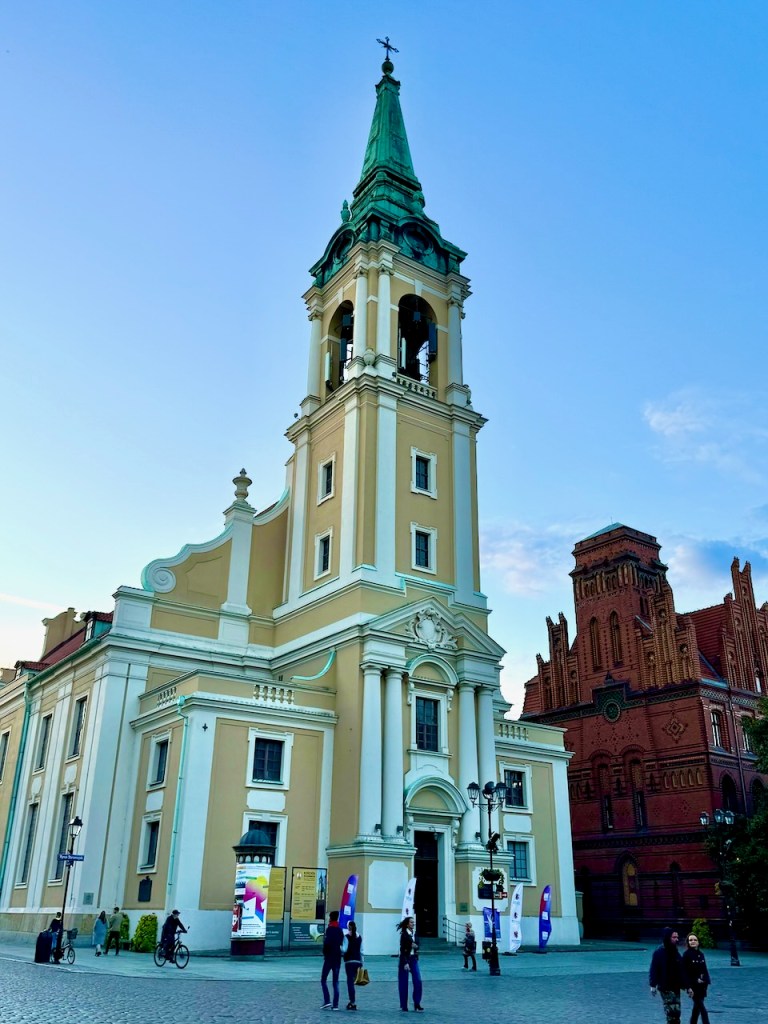 Pieni välipala valmistui nopeasti ja sitten liikkeelle. Heti seuraavassa korttelissa oli komea kirkko. Historialtaan mielenkiintoinen. Alun perin evankelinen kirkko, nykyisin roomalaiskatolinen, vuoteen 1920 asti se oli Preussin armeijan ja sitten Puolan armeijan varuskuntakirkko. Siinä on Toruńin korkein torni, 86 metriä korkea.
