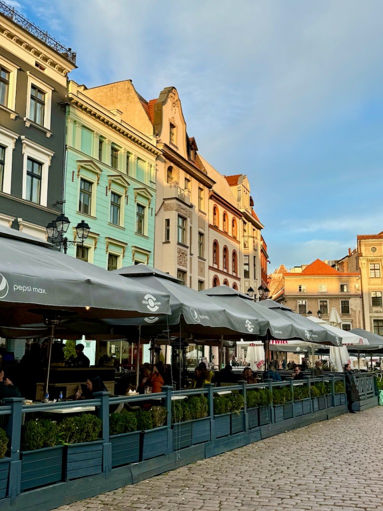 Torunin kävelykatujen näkymät olivat oikein mukavia. Kahviloita, terasseja, erilaisia kauppoja ja kauniita talojen päätyjä riitti.