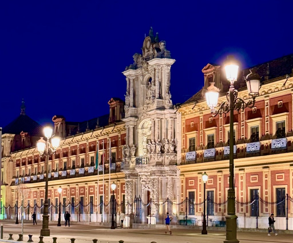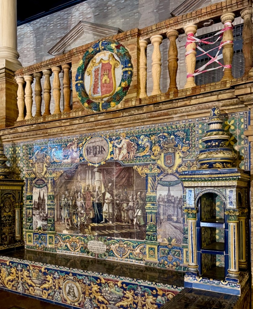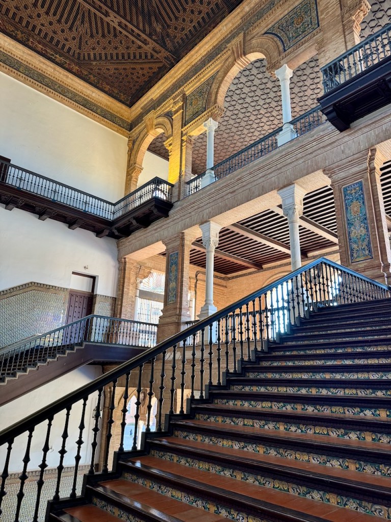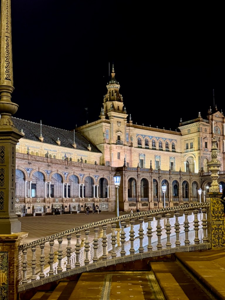Tätä katsellessa ihmettelee kovasti, mikä tämä on. Seltys on se, että se on rakennettu 1929 Iberoamerikkalaista suurtapahtumaa varten. Siinä oli edustettuna Espanjan, Portugalin ja Yhdysvaltojen lisäksi latinalaisen Amerikan valtioita ja maailmannäyttely kesti yli vuoden. Tarkoituksena oli parantaa Espanjan välejä maihin, joiden kanssa suhteet eivät olleet siirtomaa-ajan jälkeen kovin hyvässä kunnossa. Aika upea ja ihmeellinen rakennelma tällaiseen tarkoitukseen. Nykyisin se on lähinnä toimistokäytössä.