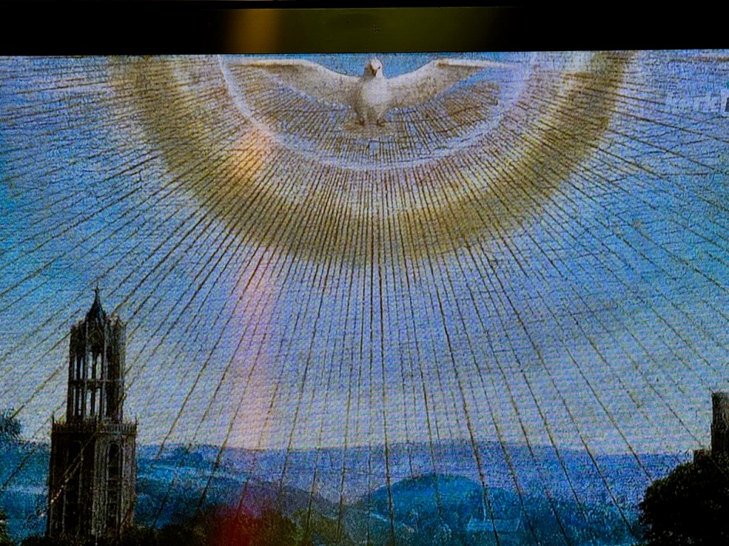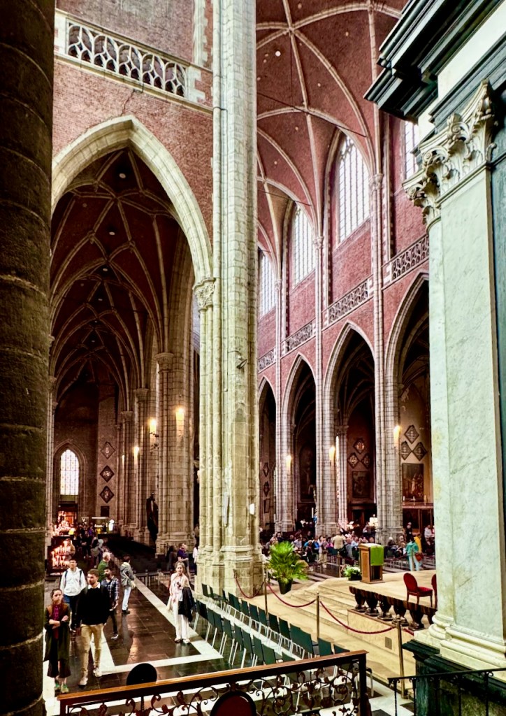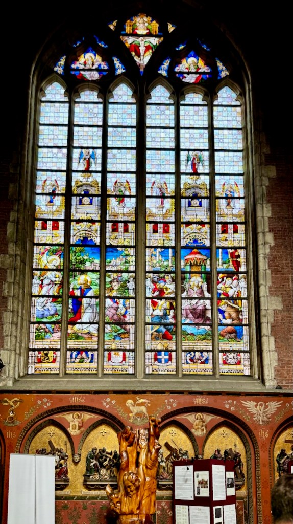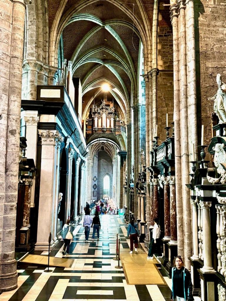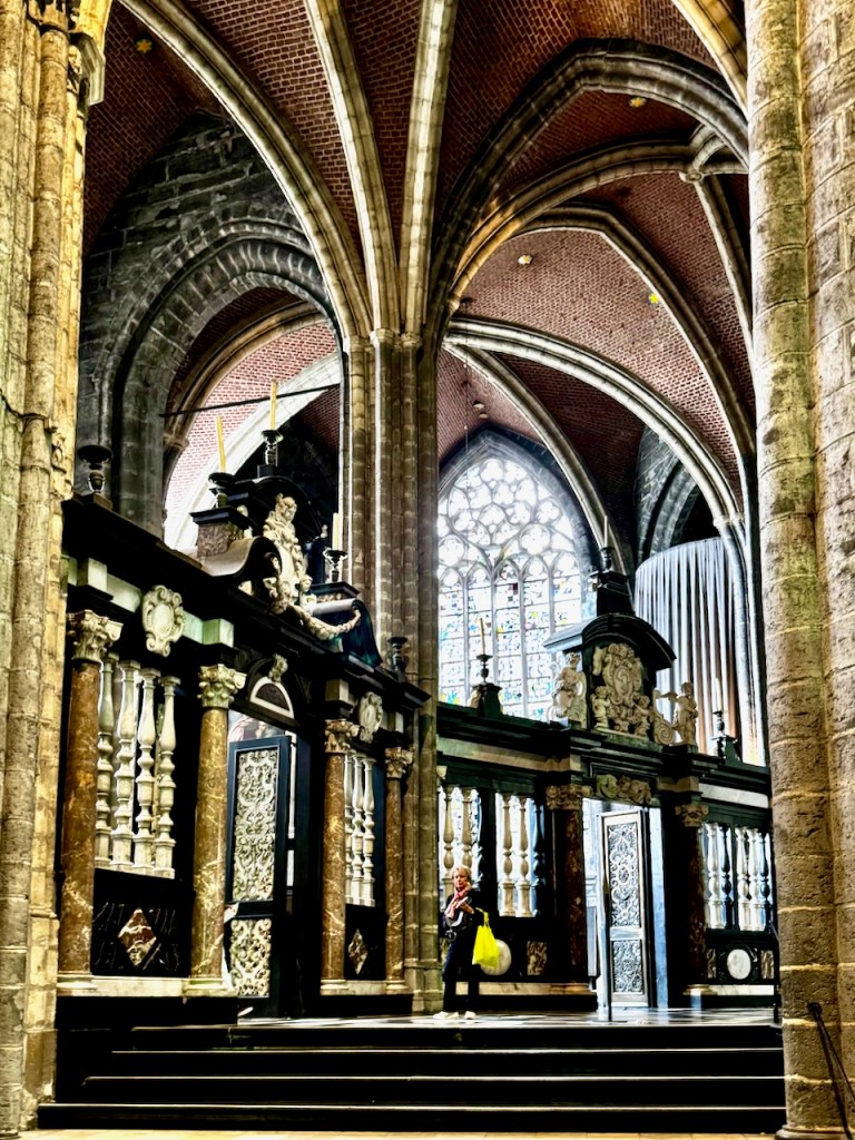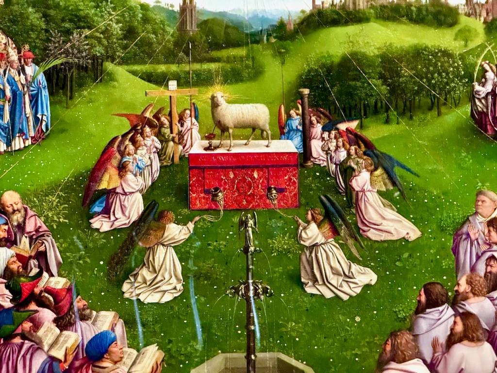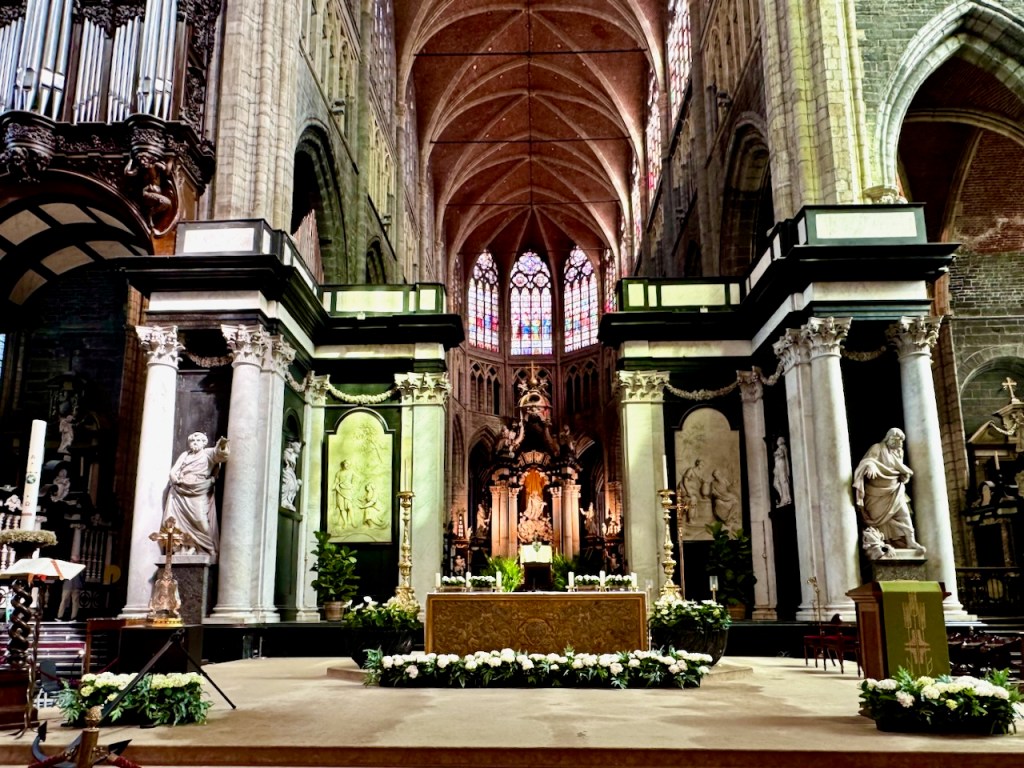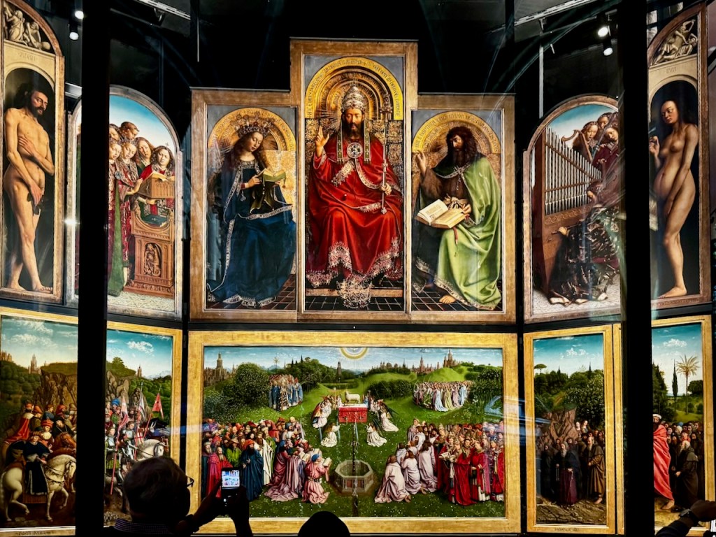 Kirkossa on alttarin takana osa, jonne on erillinen sisäänpääsymaksu ja aivan mahtavia pienempiä kappelisyvennyksiä. Täällä on myös varsinainen taideteos, ”Mystisen karitsan palvonta” (1432), jonka teema on ihmiskunnan pelastuksen salaisuus. Se on suuri alttaritaulu, joka koostuu 12 paneelista. Alempana keskellä karitsa symboloi Jeesuksen uhria, yläosa kuvaa Jumalaa, Neitsyt Mariaa, Johannes Kastajaa, enkeleitä ja toisiaan palvovia pyhiä. Tämän taideteoksen yksityiskohtia, symboliikkaa ja historiaa pääsi katsomaan videoltakin yhteen pieneen huoneeseen.
