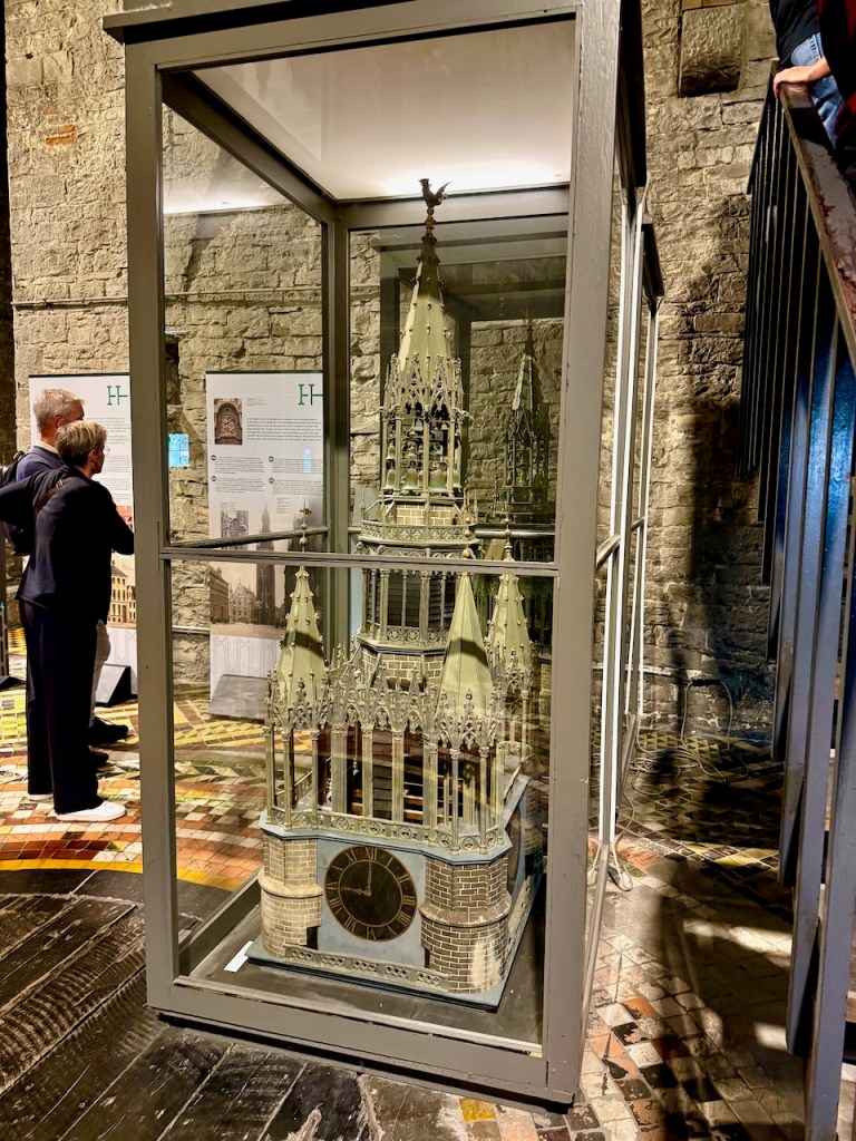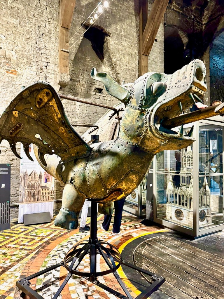 Sitten Belfort van Gentin eli Gentin kellotornin suuntaan. 91 metriä korkea Unescon maailmanperintökohde on se Gentin paras näköalapaikka. Tällä kertaa ylös ei tarvinnut kiivetä pelkkiä portaita, ison osan pääsi hissillä. Takaisin tullessa joko en löytänyt hissiä tai muuten vain portaita oli pidemmästi. Mutta ei haitannut. jo matkan varrella eri kerroksissa oli nähtävää. Paikallinen lohikäärme oli mainittu useissa esitteissä.