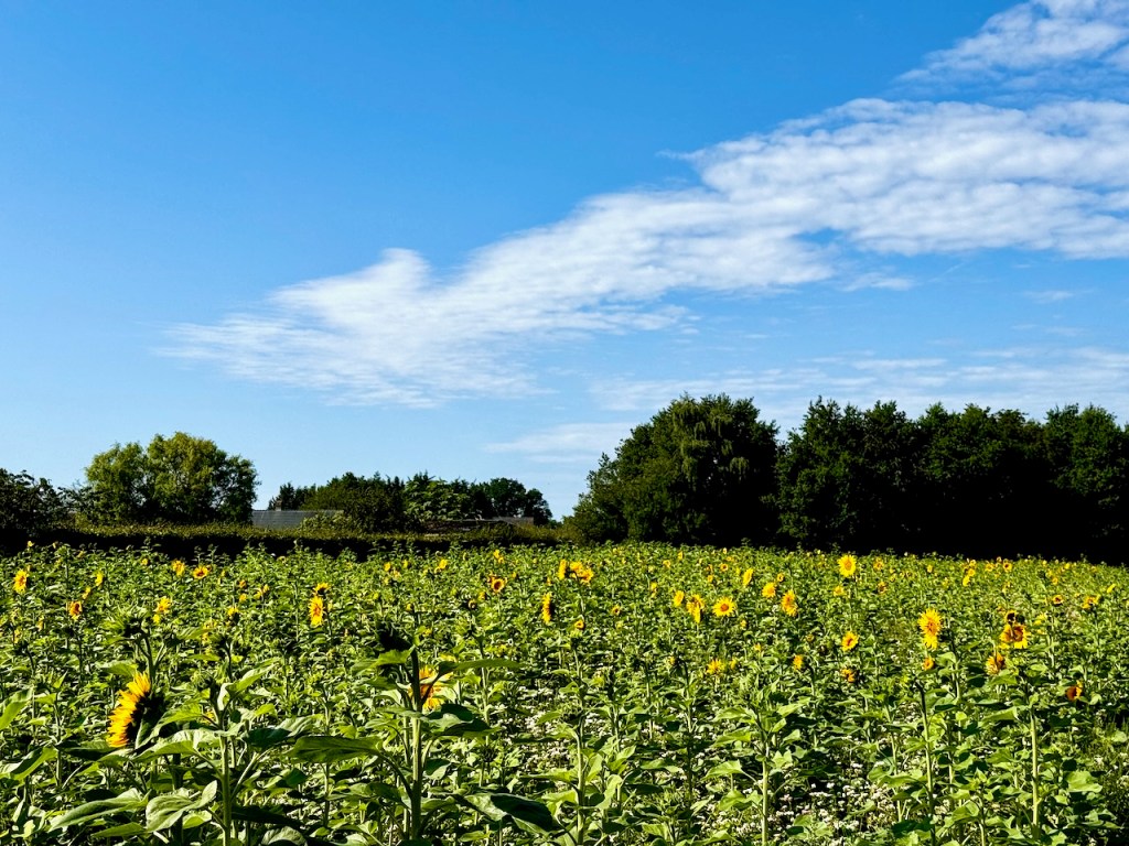Tällaisesta maisemasta oli ollut melkein haikeaa lähteä kotiin. Joka päivä olimme talon vieressä nähneet auringonkukkien lisääntyvän. Kuvasi kokemustamme.