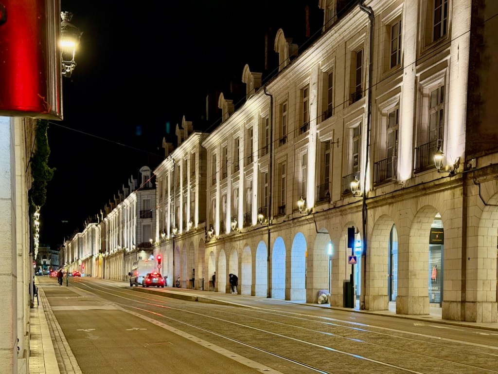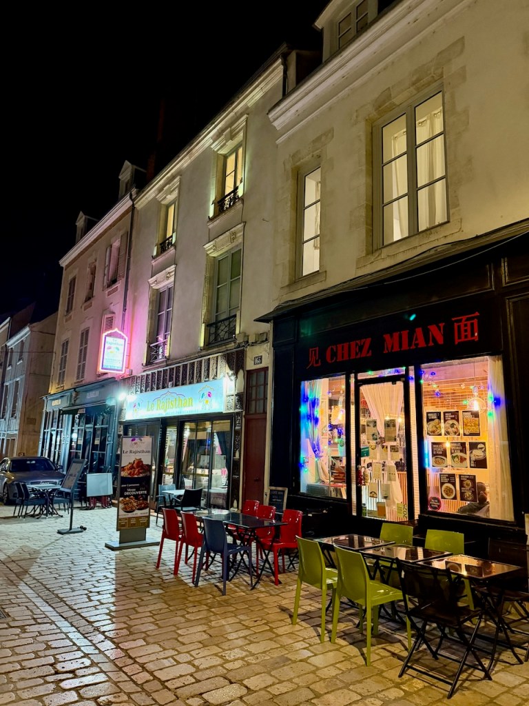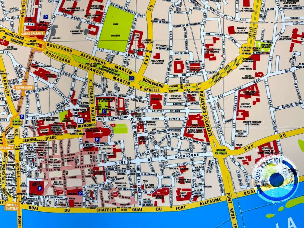 Näiden aukioiden ja Loire-joen välillä on Orléansin vanhaa kaupunkia, joiden kujilla on myös koristeellisia taloja ja paljon pikkukaduilla ravintoloita ja terasseja. Tässä Rue de Bourgogne, joka ilmeisesti on ollut vanha pääkatu,