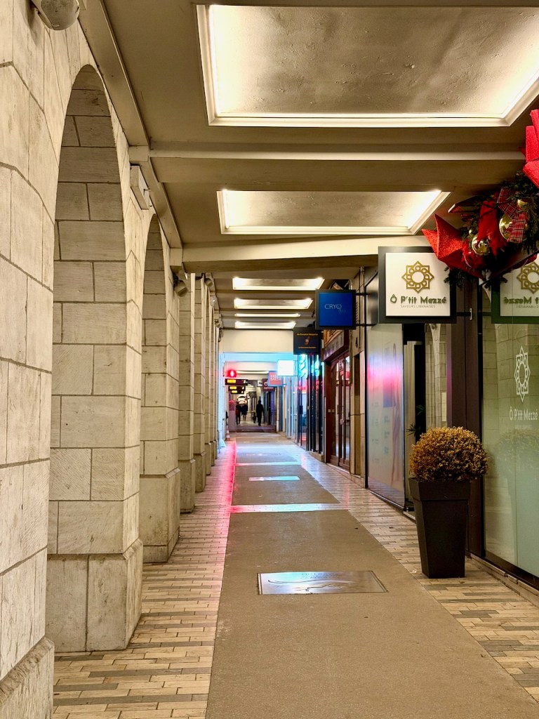 George V:n komean sillan kohdalta käännyttiin keskustan suuntaan tätä komeaa Rue Royale katua. Jalkakäytävä oli hienon holvin alla.