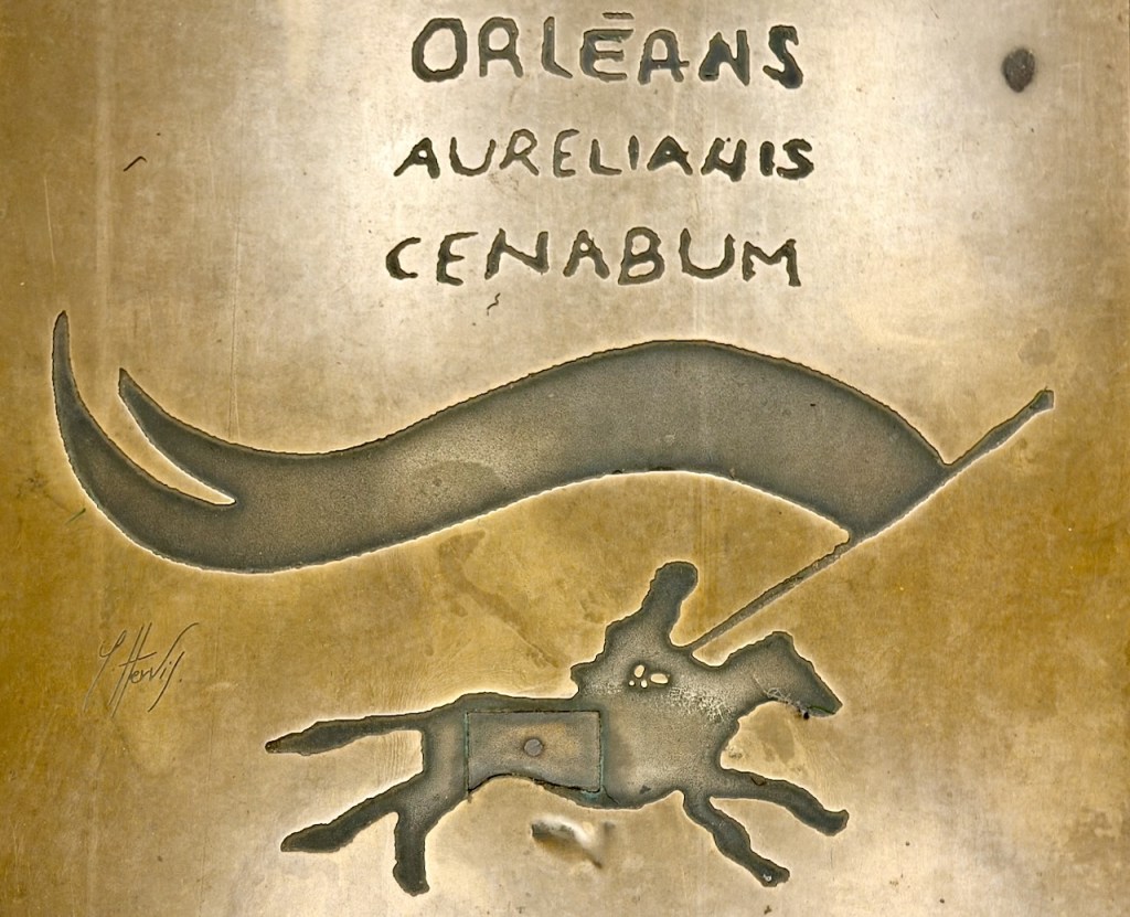 Jalkakäytävällä oli vähän väliä tällainen laatta. Siinä ovat Orléansin kaupungin historialliset nimet. Cenabum oli kaupungin alkuperäinen gallialainen nimi ennen roomalaisten valloitusta, Aurelianis nimi Rooman valtakunnan kaudella, keisari Aurelianuksen mukaan ja tietysti vielä kaupungin nykyinen nimi.