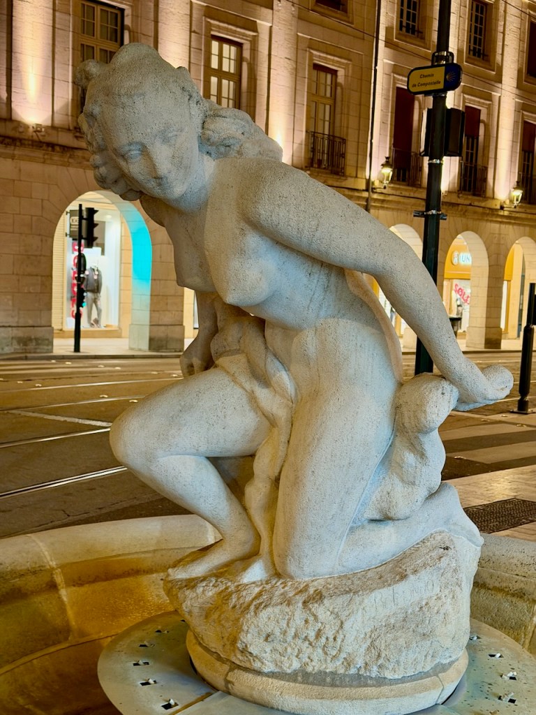 Katedraalin aukiolla oli kaksi kaunista veistosta. Fontaine Nordin patsaan huipulla ratsastaa lapsi delfiinin selässä ja heitä kannattelevat jonkinlaiset merenneidot.