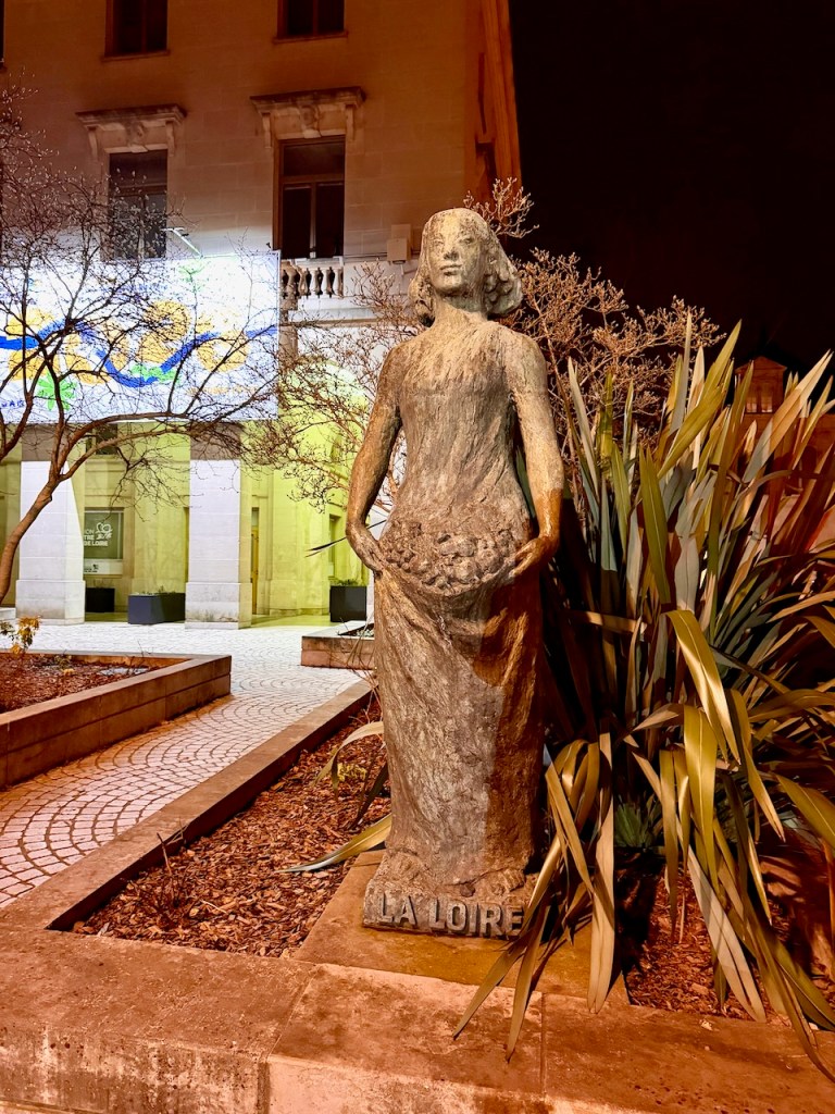 La Loire on nainen, joka kantaa jotain käsissään. Takana rakennuksen seinällä oli joku kartta, mutta jäi katsomatta, mikä. Näyttää Loire-joelta.