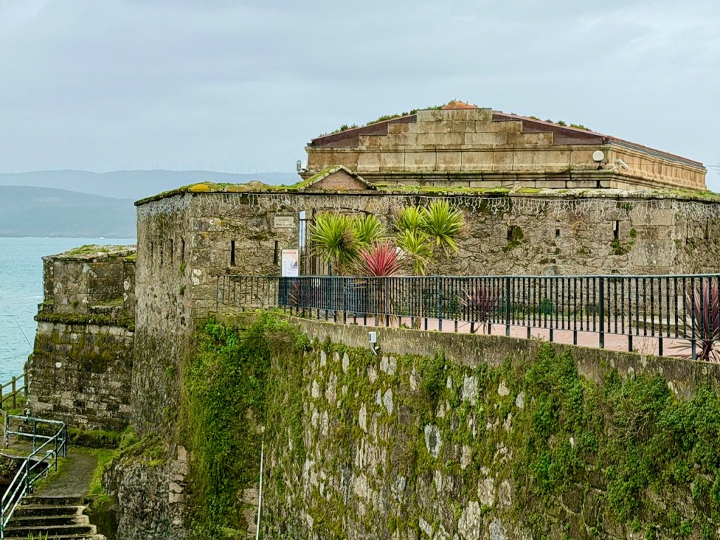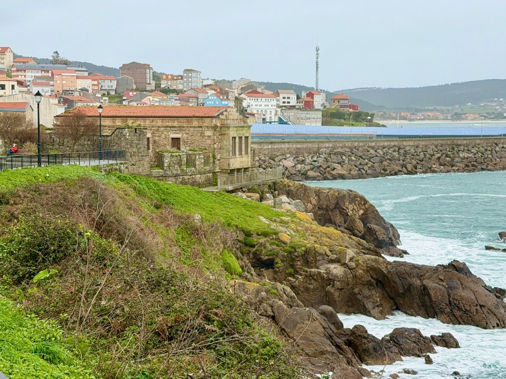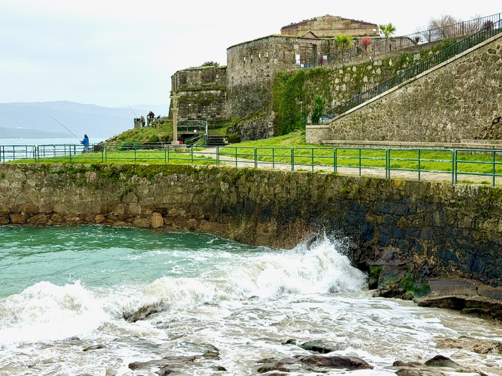 Pysähdyimme Fisterran kaupungissa katsomassa muutakin. Tällainen Castillo de San Carlos on 1700-luvulla rakennettu puolustuslinnoitus, jossa nykyisin on jokin kalastusmuseo (ei nähty sisältä). Pari kalastajaa kylläkin tästä aallokosta riippumatta.