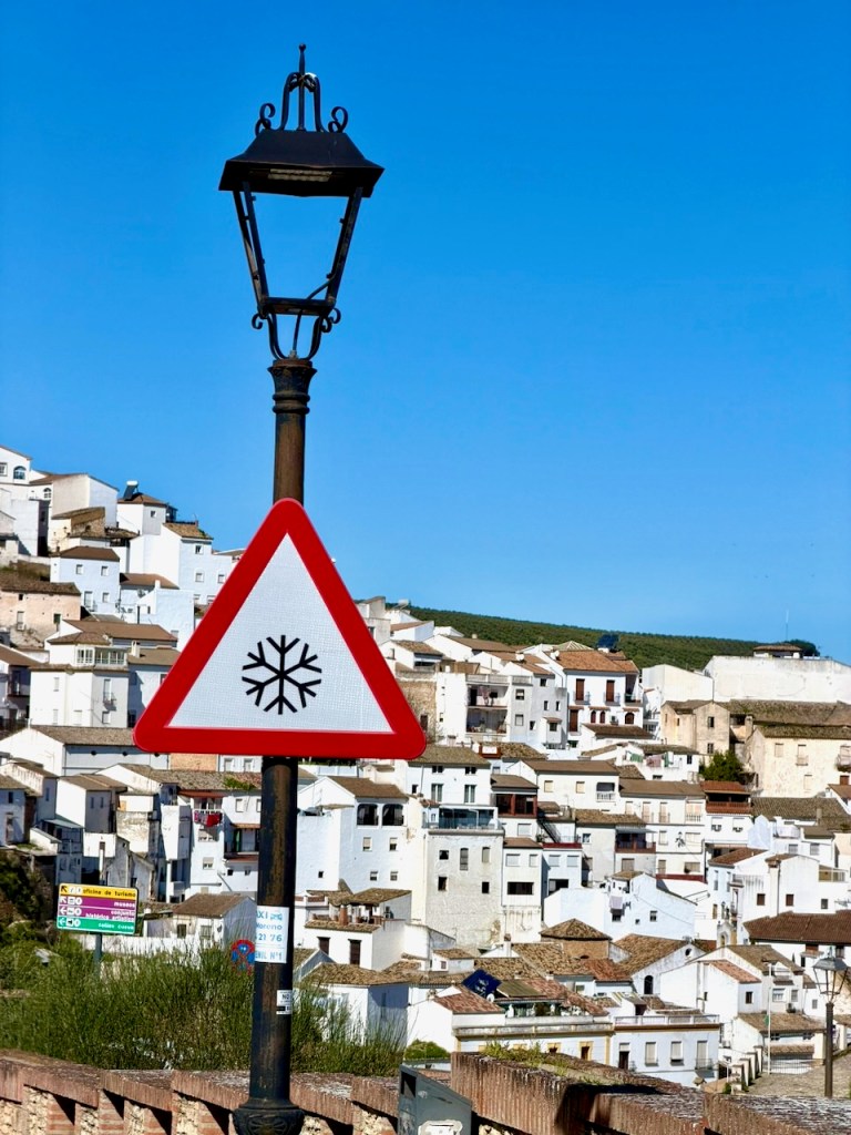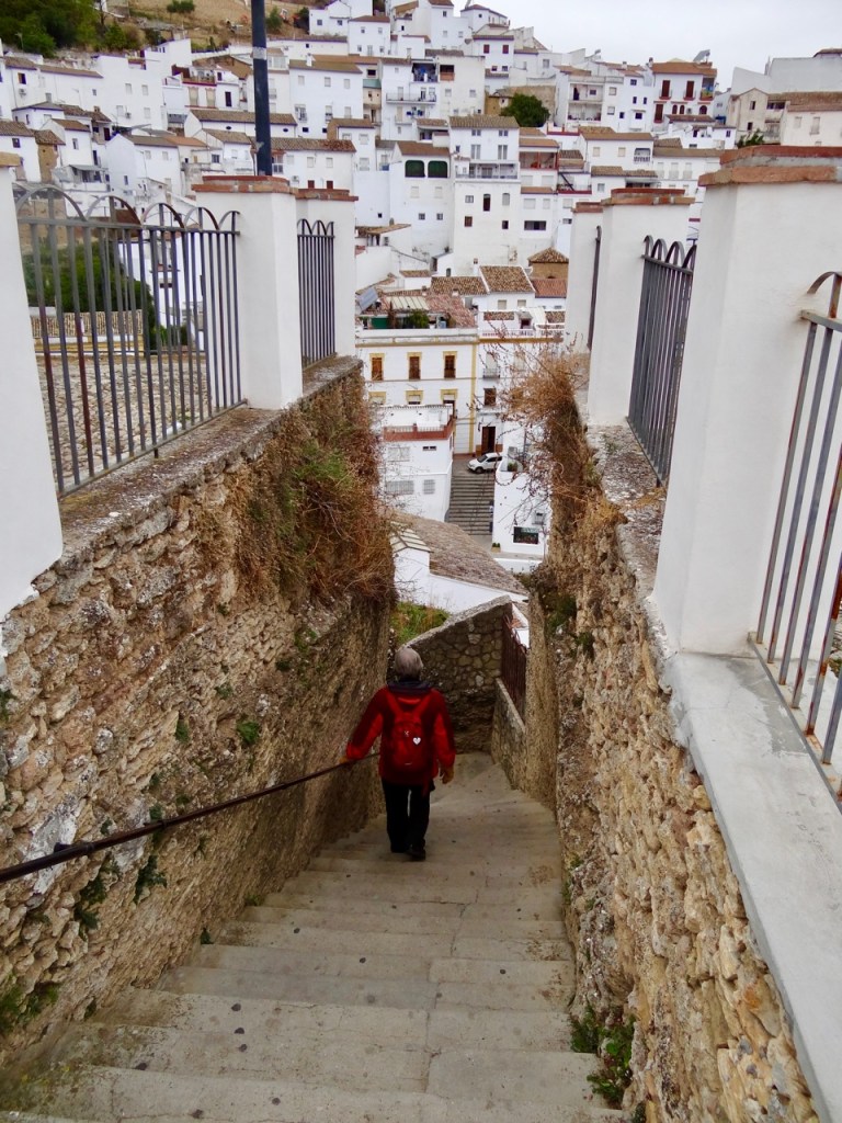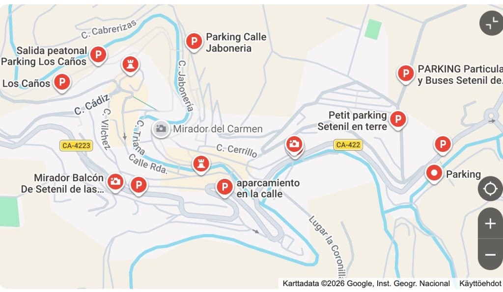 Olimme katsoneet valmiiksi Plaza Andaluciaa ja turisti-infoa lähimmän Parking Calle Jabonerian parkkitalon osoitteen. Sinne piti kiertää kylä pohjoisen puolelta, mutta mutkareitti osoittautui olevan navigaattorillemme liikaa. Sen oletuksiin näytti kuuluvan, että Volvo on alle puolitoista metriä leveä ja pystyy ajamaan myös portaita alas.