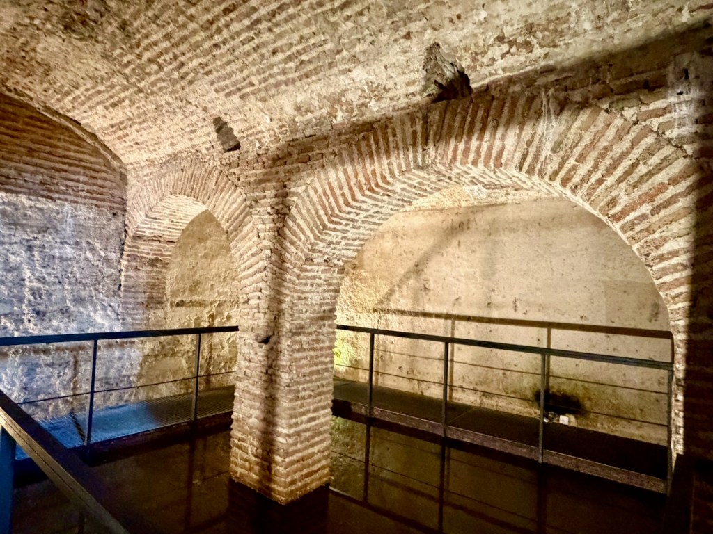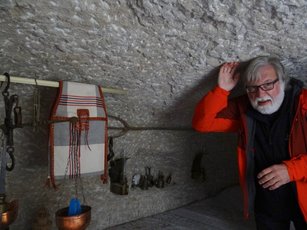 Juha kokeili ovea, joka oli kiinni, mutta saman tien sisältä tuli mies, joka toivotti tervetulleeksi ja pyysi molemmilta euron sisäänpääsymaksun. Sitten hän kehotti meitä kiipeämään parit portaat ylös ja ottamaan kuvia. Toisella kertaa käydessämme mies tarjosi maistiaisia, perunalastuja, oliiveja ja paahdettuja manteleita sekä pienen lasillisen.