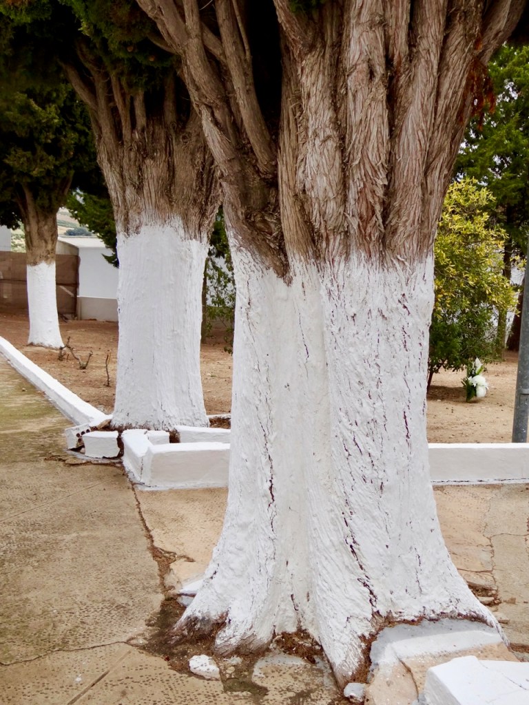 Tällaista emme muistaneet muualla nähneemme. Isojen puiden rungot oli maalattu valkoisiksi.