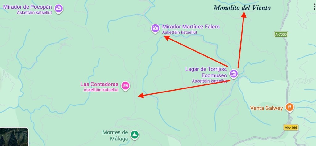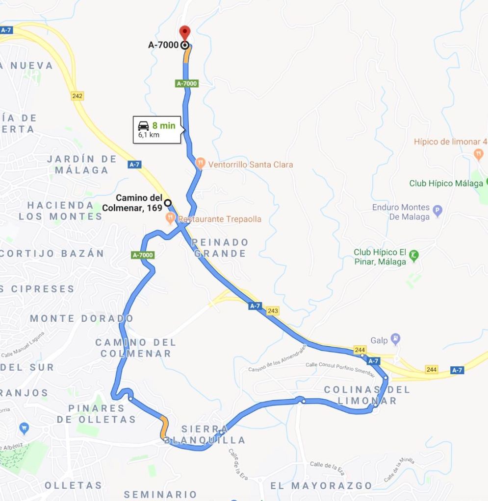 Aloita näin. Parhaat paikat patikkaretkien aloittamiseen ja näköalapaikoille ajamiseen löytyvät A-7000 -tien eli Malagan ja Colmenarin välisen tien varrelta. Tien alkuun joutuu vähän mutkittelemaan Malagan suunnasta ja myöskään moottoritieltä A7 ei ole tuolle tielle suoraa liittymää. Navigaattori ohjaa Malagan pohjoisosan kautta pikkukatuja ja mutkia, eli etsimme muuta reittiä. Tämä kierros on osoittautunut helpoimmaksi, A7 tieltä, kunnes on liittymä Limonariin ja siitä sitten vähän matkaa enää mutkittelua: