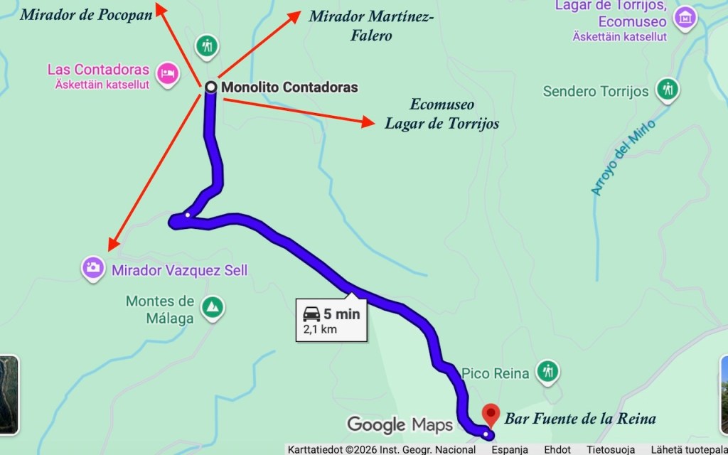 Eli El Cerradoon ja Los Contadorasiin pääsee kääntymällä Fuente de la Reinan kohdalta metsään. Torrijoksen ekomuseoon on oma viitta muutamaa kilometriä myöhemmin Malagasta päin tullessa. El Cerradosta voi vaeltaa Mirador de Cochinolle, Contadoresista Pocopanille ja Martínez Felerolle tai Torrijokseen asti.