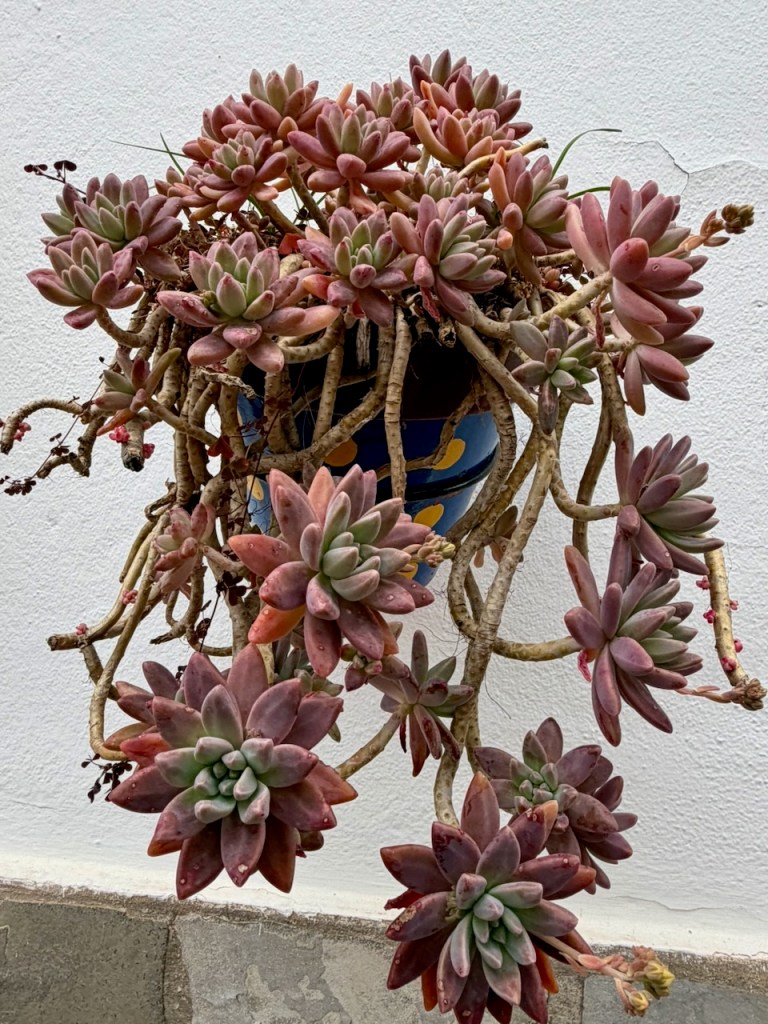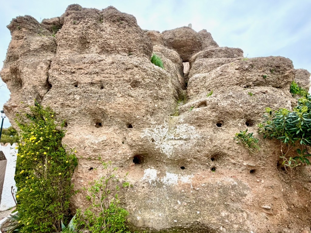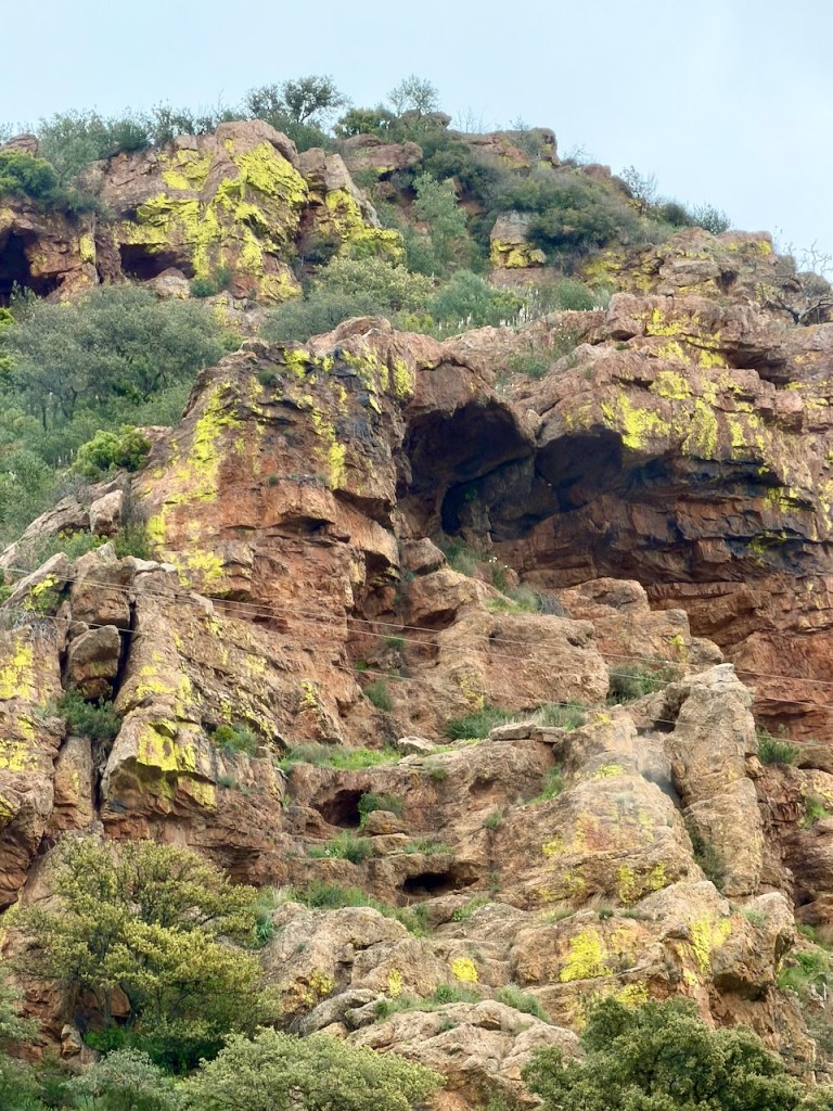 Googletin ja sain selityksen, että nuo kirkkaan keltaiset ja oranssit läikät Comaresin jyrkillä rinteillä johtuvat jäkälistä, joita kasvaa paljaalla kivipinnalla. Ne voivat olla haavankeltajäkäliä, jotka ovat jopa yleisiä Välimeren alueen aurinkoisilla kallioilla. Jäkälällä voi olla myös ”Aurinkorasva”, eli keltainen suojapigmentti, joka suojaa sitä Axarquian voimakkaalta UV-säteilyltä. Kuivalla säällä ne ovat keltaisempia, kostealla vihreämpiä. Kaikkea sitä oppii, kun viitsii kysellä.