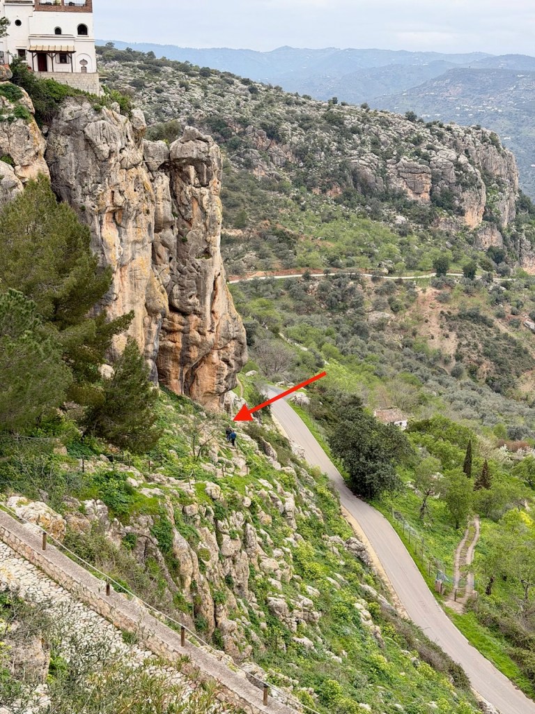 Tämän kuvan otin linnan näköalapaikalta, kertoo ainakin jotain siitä, missä tuo Fuente Gorda reitti on. Kuvassa on nuolella merkitty pikku pisteenä yksi pariskunta, joka käveli sitä alas. Siis polkua, ei tuota ajoväylää. Pääsee tuolle ajoväylälle toki portaita alas.