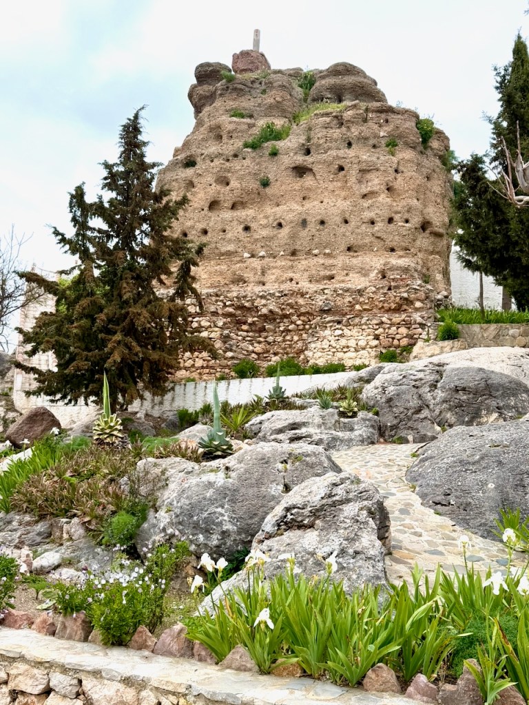 Parkkipaikkakin on joka kerta ollut melko tyhjä. Tuossa aivan portin vieressä on autoja, alempana rivi lisää ja vielä alempana ihan vain muutama samoin kuin busseille varatussa osassa. Ja mikäli liikennettä oikein tulkitsin, niistakin autoista ainakin osa oli huoltotöitä tekevien miesten autoja. Eli helpppo mennä autolla. Kylään kiipeämisen kierros alkaa tästä Puerta de Malagasta.