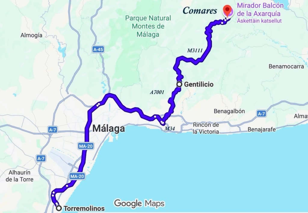 Ensimmäisen kerran ajoimme Comaresiin Torremolinosista lyhintä reittiä eli Malagan jälkeen A7-tieltä Oliaksen kylän kautta. Velez-Malagan kautta olisi ollut parempi tie, mutta paljon pitempi matka. Siis näin: Eli tieltä A7 käännytään tielle M24 ennen Rincon de la Victoriaa, sitten jatketaan tietä A7001 ja M111 Comaresiin.