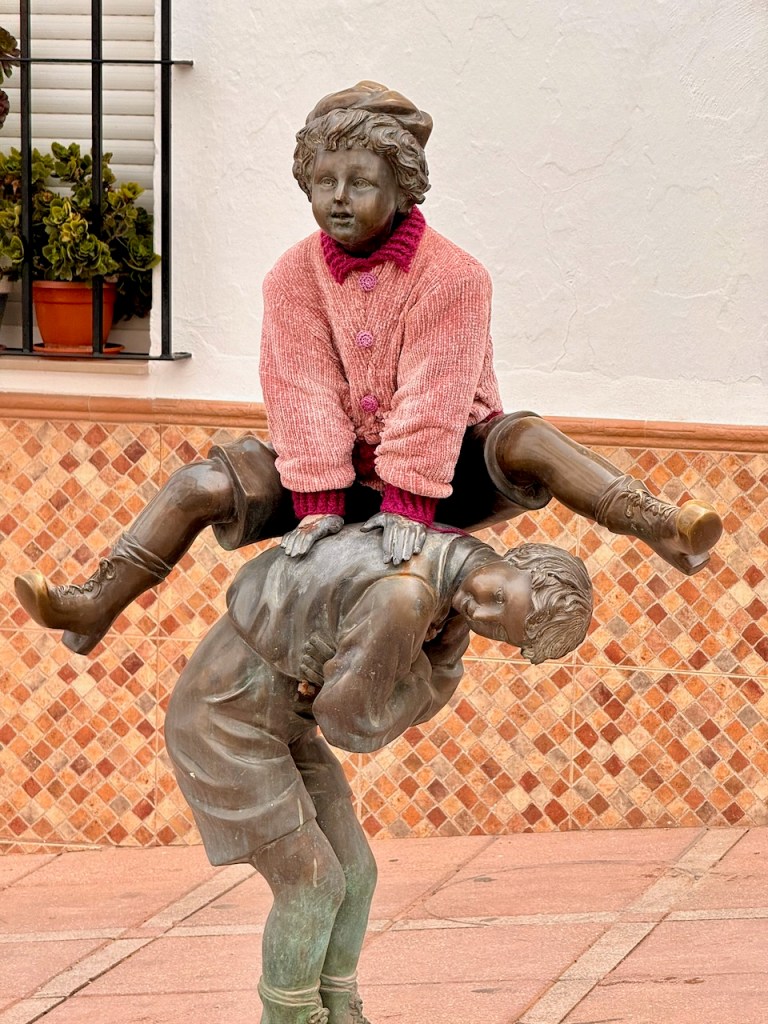 Kaduilla törmäilee milloin mihinkin, eli esim. tällaiseen. Tämä veistos kuvaa lapsia leikkimässä perinteistä ”a piola” -nimistä hyppyleikkiä. Muistuttaa suomalaista pukkihyppelyä. Teos on Plaza de la Concordia -aukiolla, lähellä kaupungintaloa. Hauskaa oli nähdä tällainenkin idea: pronssisella patsaalla on aito neuletakki.