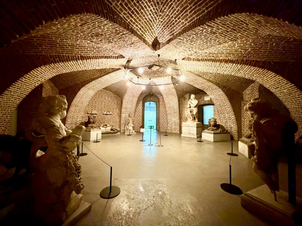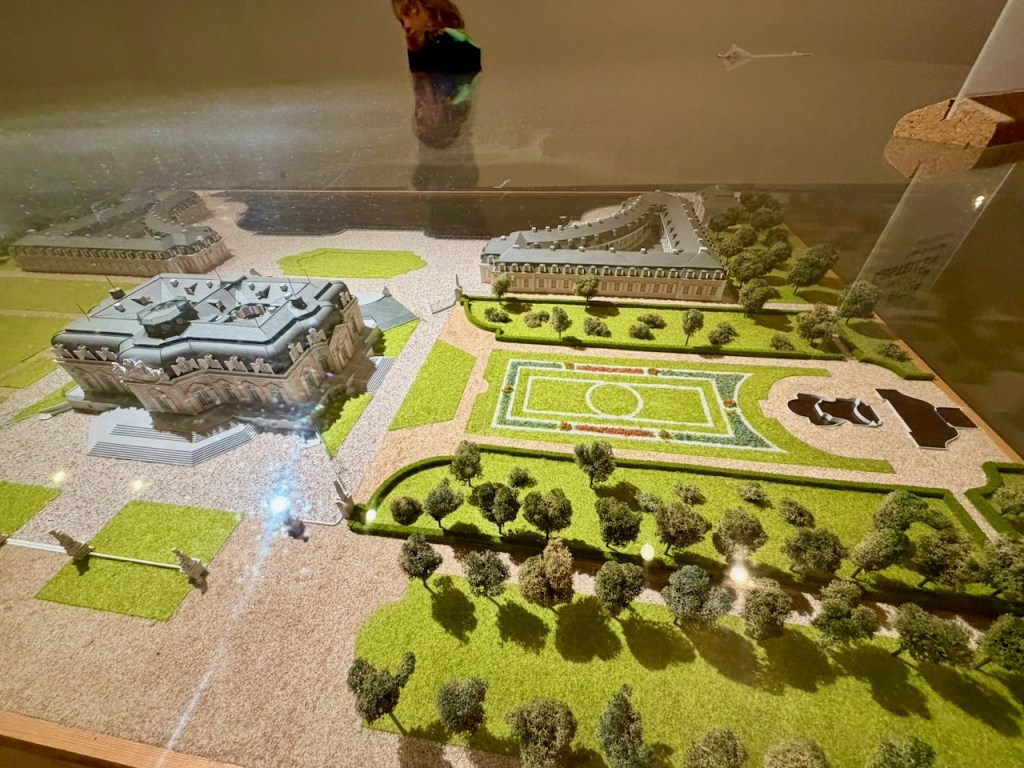Liput ostetaan tuon alimman kuvan oikeanpuoleisesta päädystä ja sitten palataan sen rakennuksen tähän päähän ja laskeudutaan portaat alas linnan alimpaan kerrokseen. Siellä on museo ja linnasta pienoismalli, josta näkyy, miten se on lampien ja puiston keskellä.