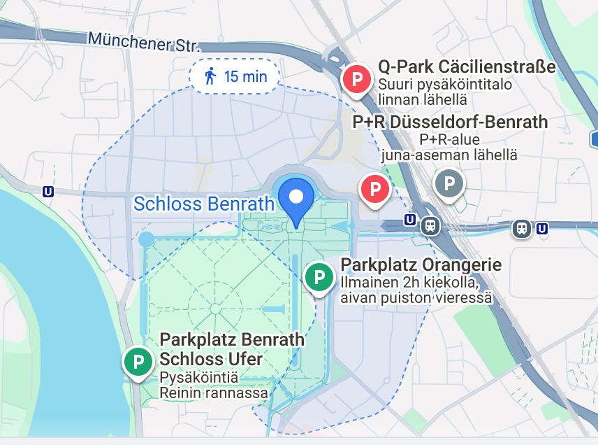 Benrathin linna on Düsseldorfin lähellä. Sinne oli helppo löytää. Parkkipaikka olikin vähän harhailua, emme nähneet viittoja, vaikka parkkipaikkoja oli karttaan merkitty useita.