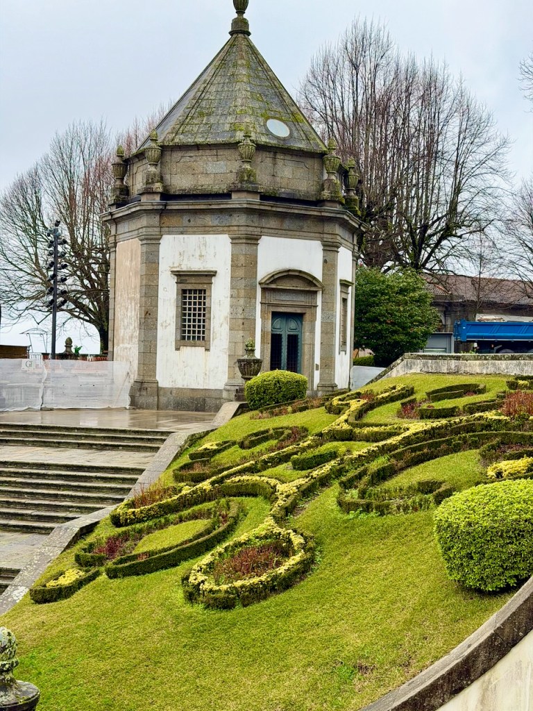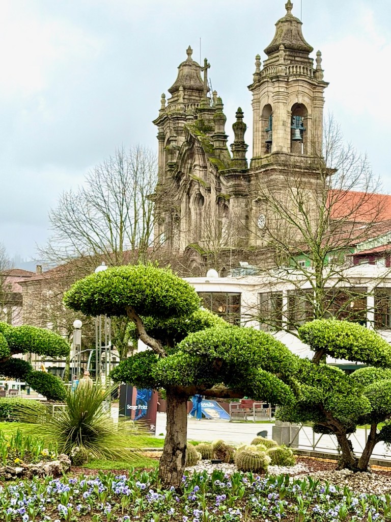 Bragassa on myös erittäin paljon kirkkoja. Tällä aukiolla näkyi heti yksi, eli osa entistä Congregados-luostaria. Sen vieressä oli nähtävissä kauniisti hoidettua puutarhaa ja puistoa, joissa kasvaa kuvassa näkyviä muotoon leikattuja puita ja pensaita.
