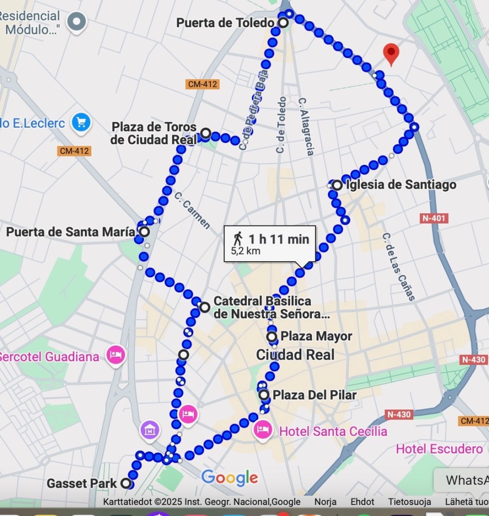 Muitakin hyviä kohteita kiersimme, eli Toledon portti (Puerta de Toledo), Härkätaisteluareena (Plaza de Toros), Pyhän Marian portti (Puerta de Santa María), Pyhän Marian Katedraali (Catedral Basilica de Nuestra Señora Maria del Prado), Pilarin puisto ja aukio (Plaza Pilar), Kaupungintalon aukio (Plaza Mayor) ja sitten ohitimme vielä Santiagon kirkon (Iglesia de Santiago). Tällainen kävelyreitti.