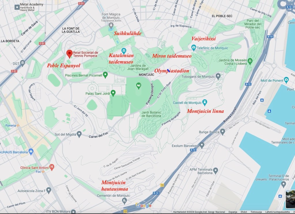 Montjuic on vuorialue Barcelonan sataman lähellä. Sen alueella on tosi monta hienoa nähtävyyttä. Montjuicin linna, rinteiden puutarhat, valtavan upea hautausmaa meren rinteen puolella, Miron taidemuseo, Museu Nacional d’Art de Catalunya eli Katalonialaisen taiteen museo ja Poble Espanyol de Montjuic, eli rakennus- ja käsityötaiteen ulkoilmamuseo. Montjuicin alueen rinteitä voi ihailla myös vaijerihissikierroksella. Kiertelimme alueen kohteissa useinakin päivinä, kun aina tuntui löytyvän jotain uutta nähtävää. Tässä kartassa on punaisilla teksteillä ne paikat, joista on tekstissä tietoa.