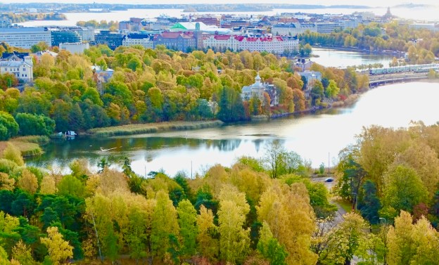 Aurinkoisen sunnuntaiaamun päähänpisto oli täydellinen ajoitus. Stadionin tornista näkyi fantastisia ruskamaisemia yli Helsingin joka suuntaan.