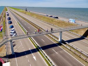Seuraavana päivänä toteutimme yhden reittivalinnan, jota olemme katselleet useita kertoja. Ajoimme Ijsselmeerin ja Atlantin välisen pitkän kannaksen. Mielenkiintoinen reitti. Parissakin paikassa oli mahdollisuus pysähtyä katselemaan maisemia. Breezanddijkin ympärillä oli enemmän tilaa esimerkiksi asuntoautoille, mutta Afslujtdikin monumentilla oli myös mahdollisuus kiivetä näkötorniin ja nauttia avarista maisemista. Kuvista jotenkuten näkyy, miten Atlantti on vähän korkeammalla kuin Ijsselmeer. Ensimmäisestä kuvasta voi jotenkin (kauhulla) aavistaa, miten Atlantti on tuolla padon takana korkeammalla kuin tie.